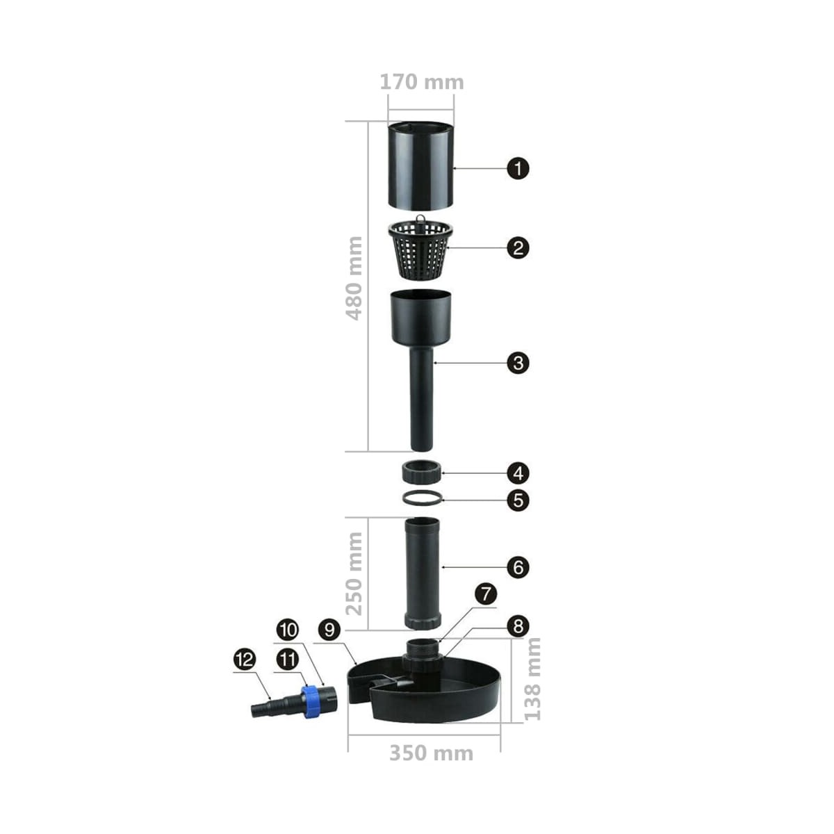 Este skimmer para estanques garantiza un agua limpia y clara con una profundidad de alta visibilidad. La superficie del cuerpo de agua se limpia continuamente de impurezas tales como hojas, hierbas, polen, insectos que han caído en el agua, etc, antes de que puedan hundirse en el fondo. Esto reduce la sobrecarga de nutrientes y la formación de algas. Con la ayuda de una bomba (no incluida en la entrega) se aspira una fina película de agua para que se cree un flujo en la dirección del skimmer. El skimmer mantiene la superficie del agua completamente limpia hasta una superficie de estanque de hasta aprox. 50 - 60 m². El caudal es de 8000-16000 l/h. Sin embargo, las partículas gruesas como las hojas o la hierba deben eliminarse regularmente para no perjudicar el rendimiento completo del skimmer. La base del limpiador de superficies para estanques se carga con piedras en el suelo del estanque. Además, la cesta colectora está diseñada con la altura ajustable y el tubo de expansión se puede adaptar a diferentes profundidades del estanque.