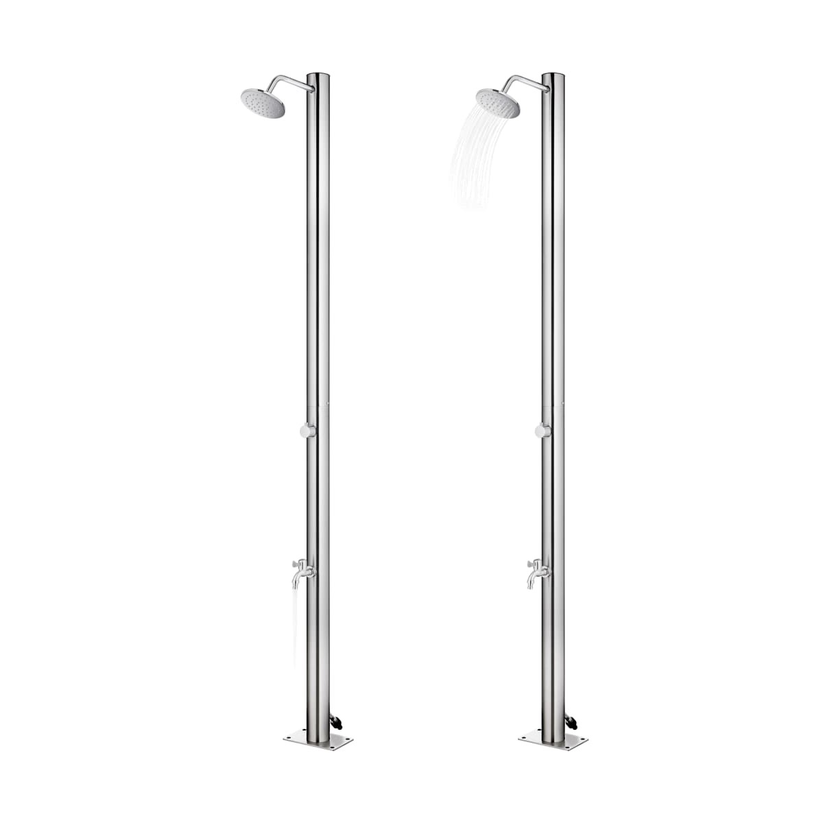 Esta ducha de jardín con un diseño moderno está destinada a ser un gran aporte a tu piscina y otras áreas de estar al aire libre. La ducha exterior está hecha de acero inoxidable, lo que la hace resistente a la intemperie. El sistema de ducha tiene un cabezal de ducha y un grifo para lavapiés para satisfacer tus necesidades de jardinería, riego y ducha rápida. La base de ducha duradera y resistente a la corrosión está hecha de WPC de primera calidad y enmarcado con acero inoxidable con un acabado cepillado, lo que garantiza una durabilidad durante años de uso. También ofrece el más alto nivel de protección higiénica, lo que la hace ideal para el jardín. Gracias a su robustez y versatilidad, el plato de ducha también puede servir como base de escalera de piscina. ¡Sumérgete en una experiencia de ducha verdaderamente relajante y disfruta del estilo moderno de este sistema de ducha al aire libre!