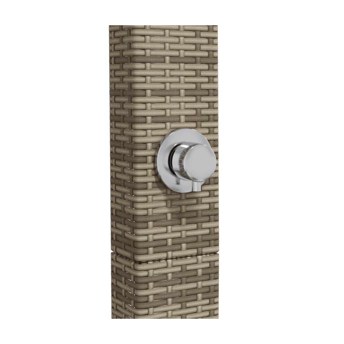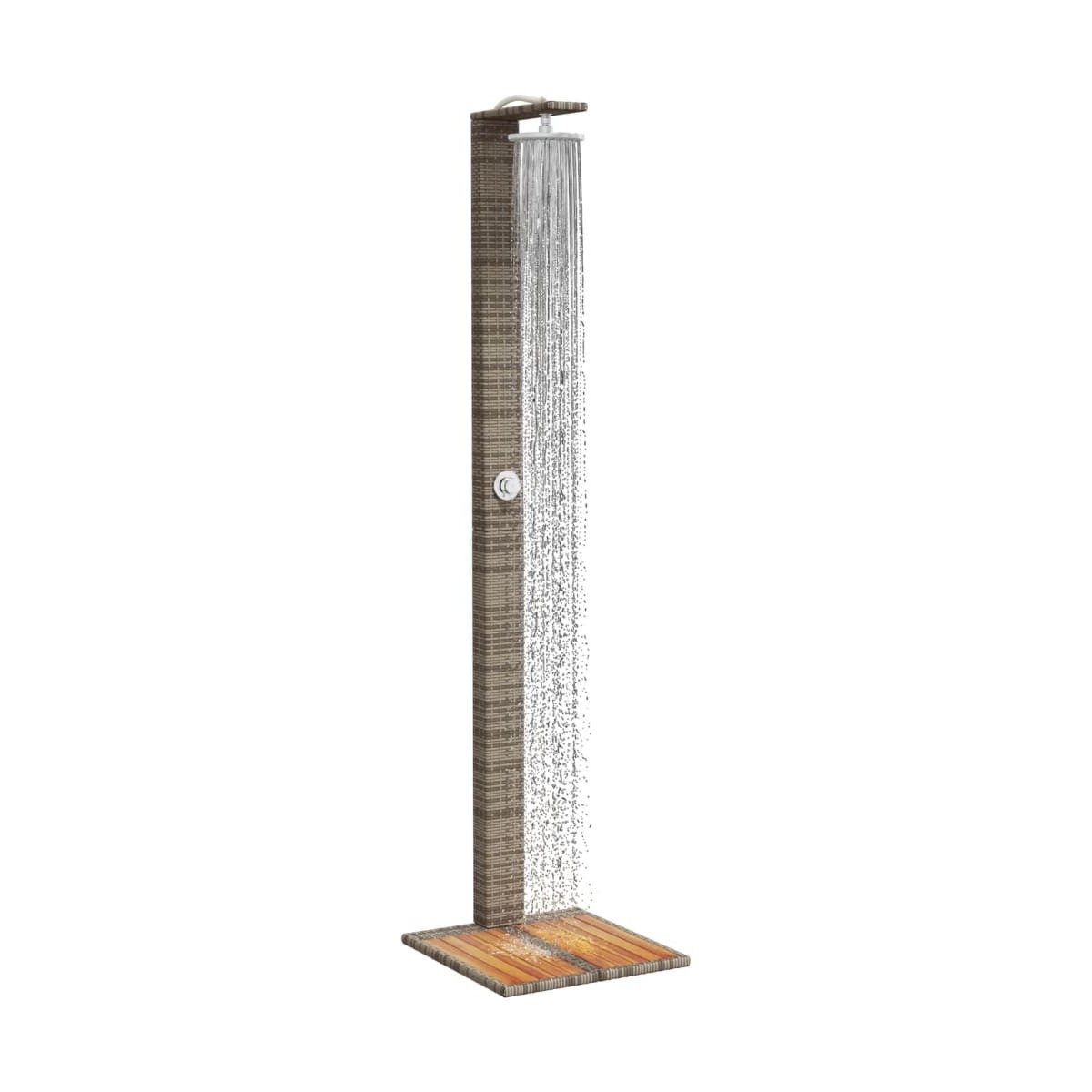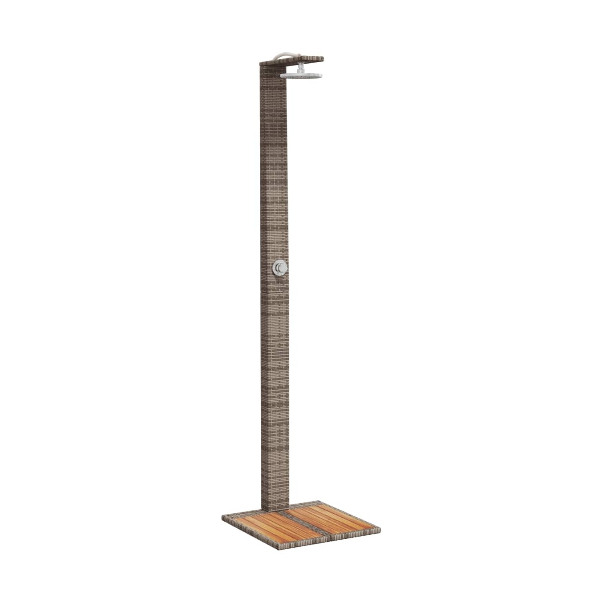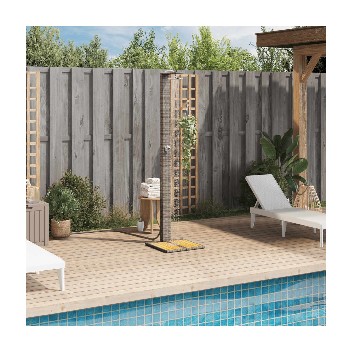 ¡Disfruta de una ducha refrescante al aire libre esta ducha exterior de ratán sintético! Material duradero: El ratán PE, también conocido como ratán sintético, es un material sintético resistente y de bajo mantenimiento que se parece al ratán natural. Es ligero, fácil de limpiar y se usa comúnmente para muebles de exterior debido a su durabilidad y propiedades resistentes a la intemperie. Base de listones de madera: Gracias a la base de madera de acacia, la ducha de exterior es estable y ofrece un lugar seguro para estar de pie durante la ducha. Además, la base de rejilla evita que el agua se acumule y mantiene los pies alejados de la suciedad. Fácil de usar: Equipada con un mango giratorio y un rociador superior a una altura ideal, la ducha de piscina es fácil de usar. Y esta ducha de exterior independiente puede conectarse a la manguera de agua o al grifo de exterior para facilitar su uso. Elegante y moderna: Con su diseño atemporal, la ducha de piscina desprende un encanto rústico y será un llamativo complemento para tu jardín o patio trasero. Estructura robusta y estable: La estructura de acero con recubrimiento en polvo garantiza que el mueble de jardín sea resistente y estable para usarlo a diario al aire libre. Información útil:La ducha debe guardarse vacía y en un lugar seco y protegido de las heladas. Para asegurarte de que tus muebles de exterior se mantengan hermosos, recomendamos protegerlos con una funda impermeable.