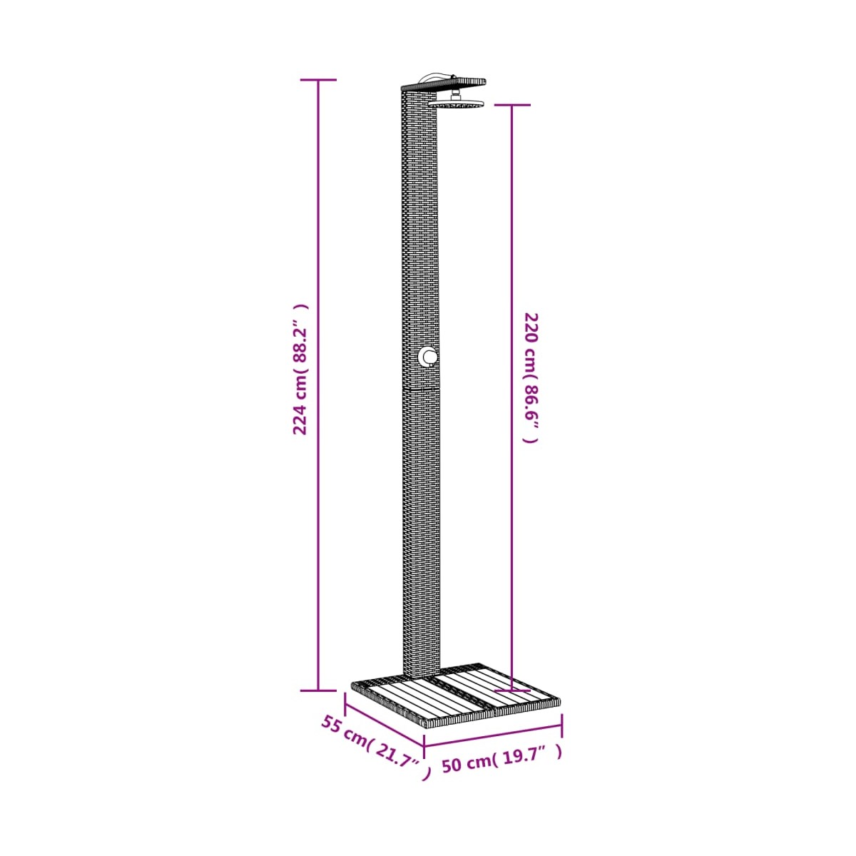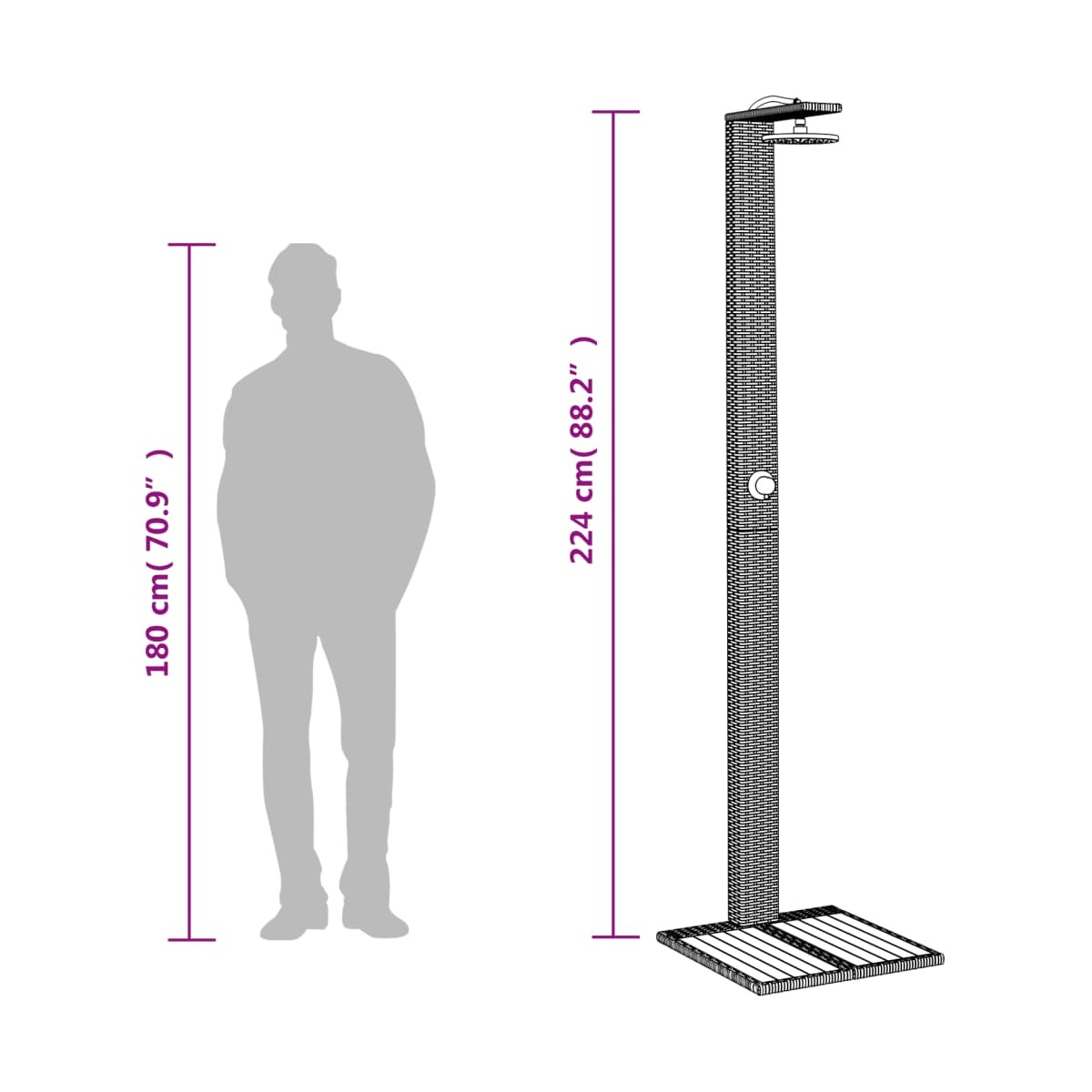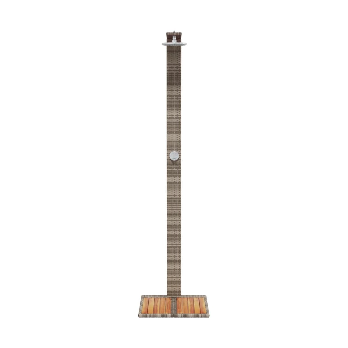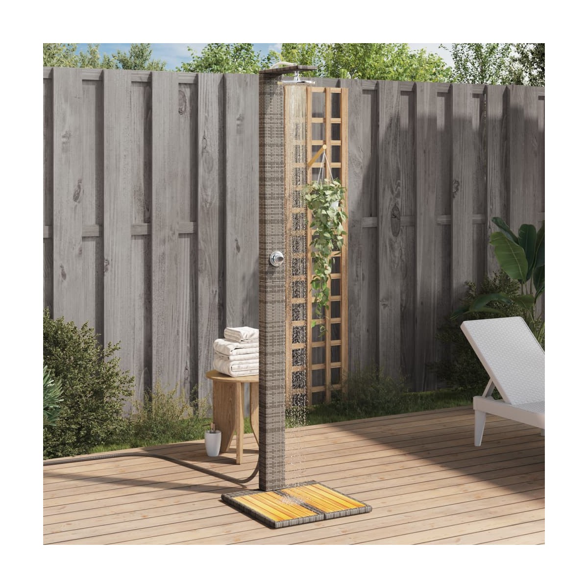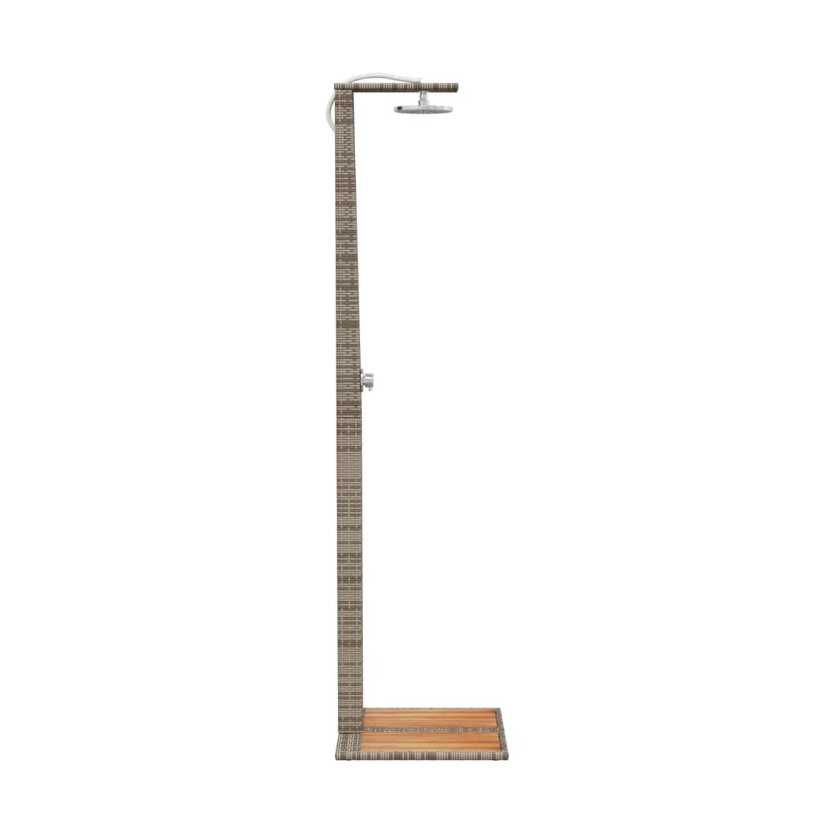 ¡Disfruta de una ducha refrescante al aire libre esta ducha exterior de ratán sintético! Material duradero: El ratán PE, también conocido como ratán sintético, es un material sintético resistente y de bajo mantenimiento que se parece al ratán natural. Es ligero, fácil de limpiar y se usa comúnmente para muebles de exterior debido a su durabilidad y propiedades resistentes a la intemperie. Base de listones de madera: Gracias a la base de madera de acacia, la ducha de exterior es estable y ofrece un lugar seguro para estar de pie durante la ducha. Además, la base de rejilla evita que el agua se acumule y mantiene los pies alejados de la suciedad. Fácil de usar: Equipada con un mango giratorio y un rociador superior a una altura ideal, la ducha de piscina es fácil de usar. Y esta ducha de exterior independiente puede conectarse a la manguera de agua o al grifo de exterior para facilitar su uso. Elegante y moderna: Con su diseño atemporal, la ducha de piscina desprende un encanto rústico y será un llamativo complemento para tu jardín o patio trasero. Estructura robusta y estable: La estructura de acero con recubrimiento en polvo garantiza que el mueble de jardín sea resistente y estable para usarlo a diario al aire libre. Información útil:La ducha debe guardarse vacía y en un lugar seco y protegido de las heladas. Para asegurarte de que tus muebles de exterior se mantengan hermosos, recomendamos protegerlos con una funda impermeable.