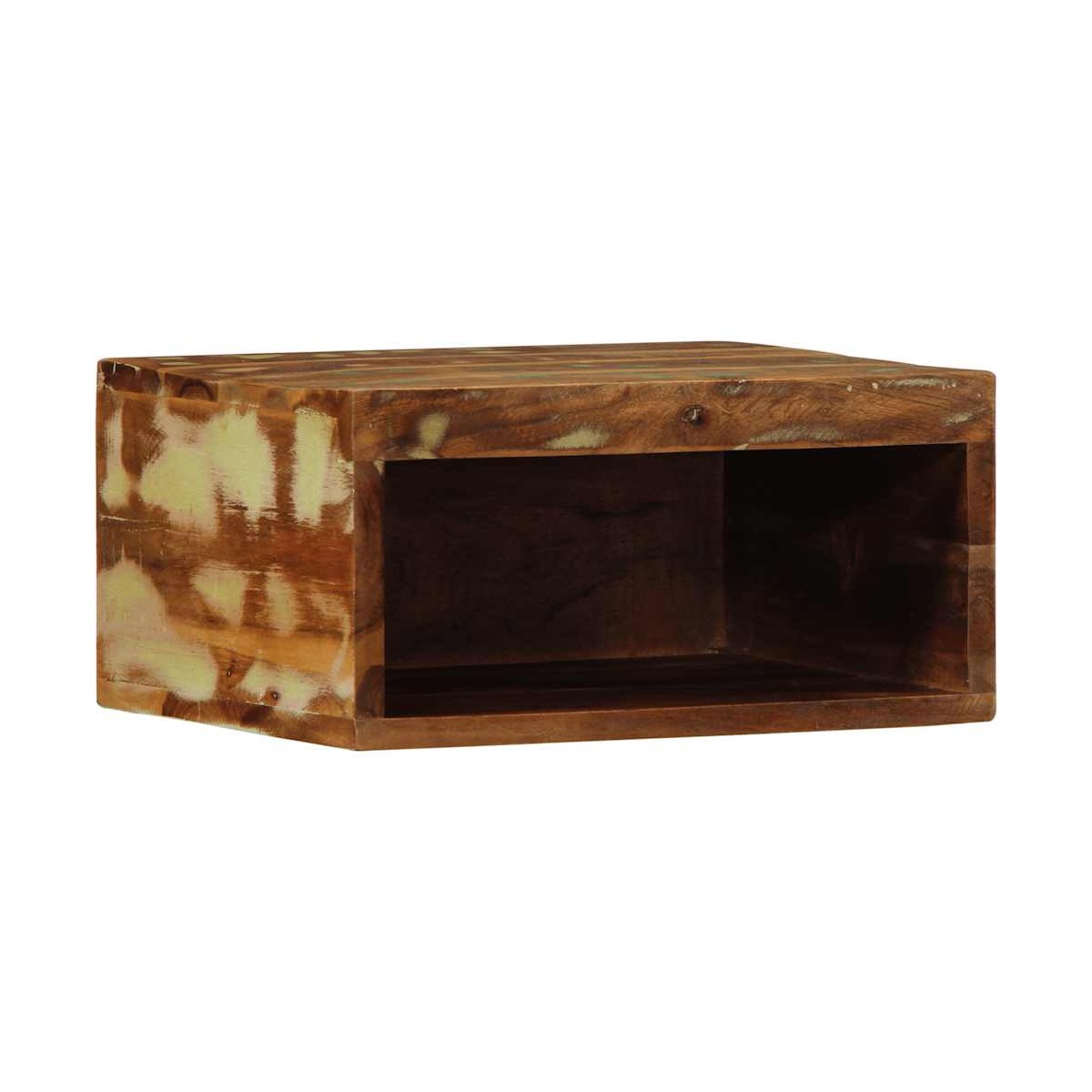 Este mueble de TV montado en la pared es la solución perfecta para la casa, con el fin de maximizar el espacio y mantener el suelo despejado. Robusto y estable: La madera maciza reciclada consta de maderas reutilizadas como la teca, la madera de mango, la madera de pino y el haya. Dichos materiales proceden de antiguas construcciones como fábricas, cobertizos y barcos. Los signos de desgaste y la estructura visible de la veta dan a cada pieza su propia historia y un aspecto único.Amplio espacio de almacenamiento: Este mueble de TV proporciona un amplio espacio de almacenamiento para mantener tus revistas, libros, DVD y dispositivos multimedia bien organizados y al alcance de la mano.Ahorro de espacio: El mueble de TV colgante se puede montar en la pared para añadir espacio de almacenamiento adicional. De esa forma, puedes liberar espacio en el piso y tener tu ambiente ordenado y limpio.Fácil de mantener: El armario montado en la pared es fácil de limpiar con un paño húmedo y requiere menos mantenimiento.