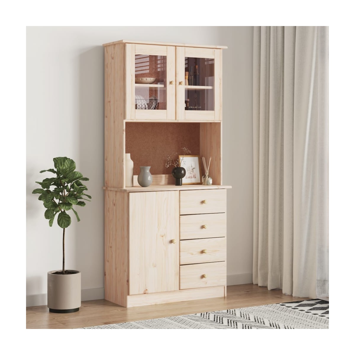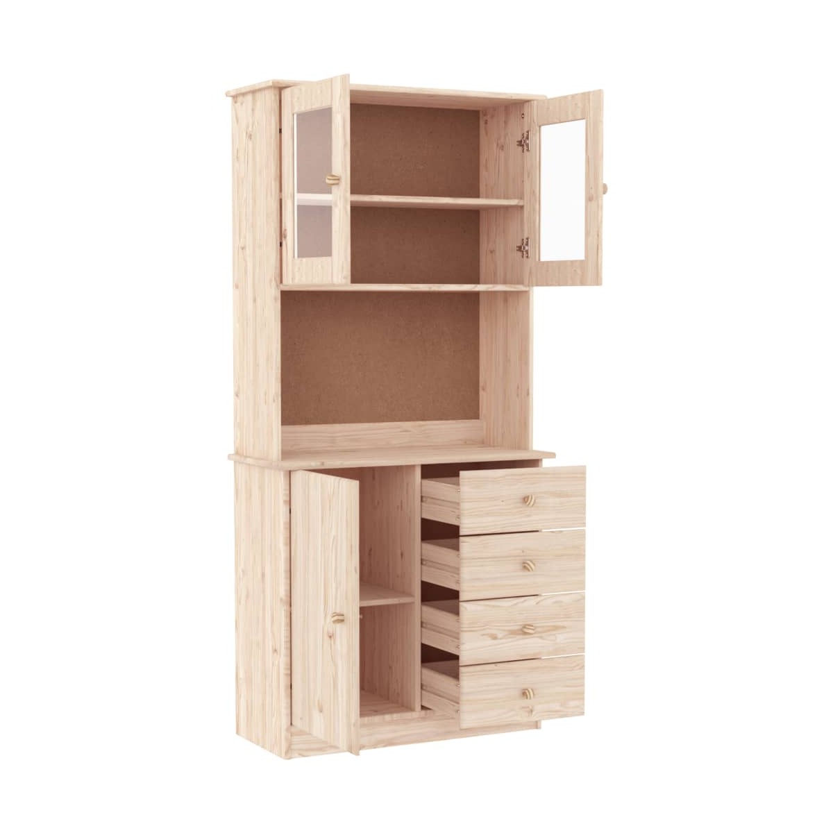 Este aparador alto de madera, con amplio espacio de almacenaje, es un complemento ideal para el salón. Madera maciza de pino: La madera maciza de pino es un hermoso material natural. La madera de pino tiene vetas rectas, y los nudos dan al material su característico aspecto rústico. Hecho de madera maciza de pino, el armario es duradero y resistente.Amplio espacio de almacenamiento: Con estantes, cajones y puertas de cristal, el armario alto te ofrece muchas opciones para guardar y exponer tus artículos favoritos.Fácil de mantener: El armario de almacenaje se limpia fácilmente con un paño húmedo y requiere poco mantenimiento.Pomos de madera: El aparador alto viene con pomos de madera que facilitan la apertura y el cierre del mueble y añaden un plus estético.Superficie sin tratar: Como el armario está hecho de madera maciza de pino sin acabado, puedes conservar su color natural pero también puedes pintarlo o barnizarlo, según prefieras. Advertencia:Para evitar que vuelque, este producto debe usarse con el dispositivo de fijación a la pared incluido.
