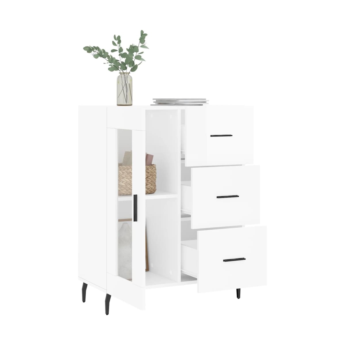 Este aparador clásico tiene un look atemporal, lo que lo convierte en un complemento perfecto para tu hogar. Material robusto: La madera contrachapada tiene una calidad excepcional, con una superficie lisa y también cuenta con fuerza, estabilidad y resistencia a la humedad.Amplio espacio de almacenaje: Con 3 cajones y 2 compartimentos detrás de la puerta de vidrio, el aparador ofrece un amplio espacio para mantener tus cosas organizadas y al alcance.Función expositora: La resistente superficie de este armario es ideal para colocar artículos decorativos, marcos de fotos y plantas.Puerta práctica: Evita que tus cosas se llenen de polvo ocultándolas detrás de la puerta del mueble de almacenaje.Patas de metal: Las patas metálicas añaden un estilo tranquilo a la casa a la vez que garantizan la estabilidad. Advertencia:Para evitar que vuelque, este producto debe usarse con el dispositivo de fijación a la pared incluido.