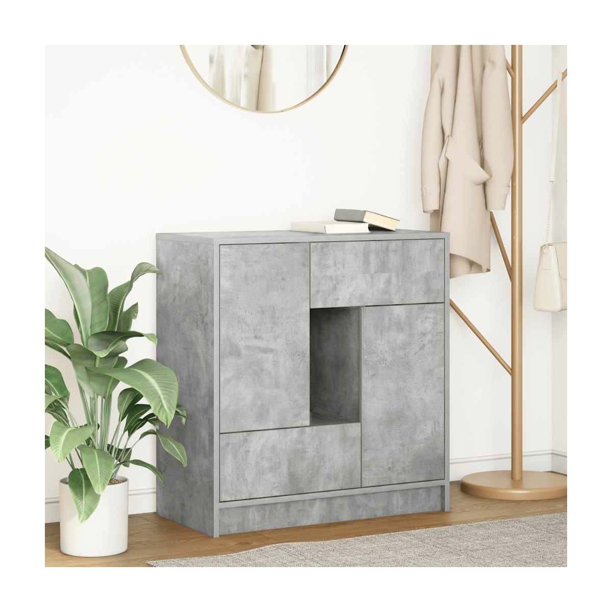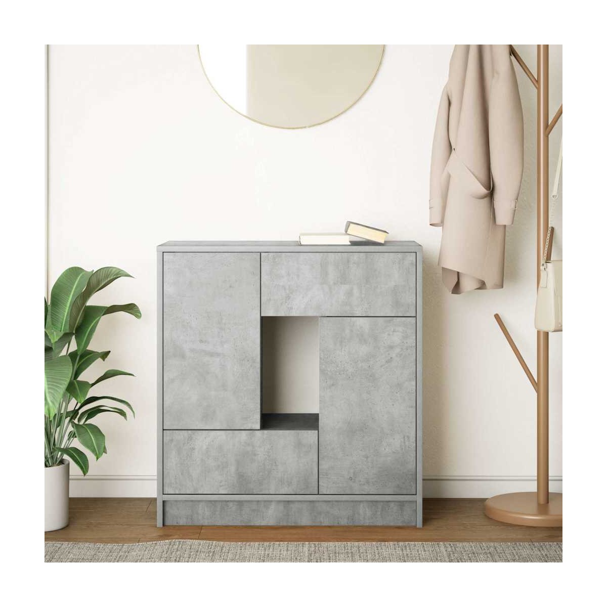El aparador ofrece soluciones de almacenamiento versátiles, manteniendo su espacio ordenado y organizado mientras agrega practicidad y estética a su espacio vital. Material estable y duradero: La madera de ingeniería es un material duradero y estable con una superficie lisa que es resistente a la humedad, la deformación y la rotura, lo que la convierte en una opción fiable para una variedad de proyectos.Amplio espacio de almacenamiento: el aparador cuenta con puertas y cajones, lo que garantiza que sus artículos estén bien organizados y ordenados. Las puertas del aparador ofrecen un espacio de almacenamiento cerrado para proteger sus pertenencias y mantenerlas fuera de la vista, mientras que los cajones brindan espacio adicional para acceder fácilmente a varios artículos.Superficie resistente: la superficie resistente de la mesa proporciona una superficie confiable para mantener sus elementos esenciales a mano, lo que la hace ideal para el uso diario. Ya sea que esté exhibiendo marcos de fotos, elementos decorativos o platos para servir, su durabilidad garantiza que pueda realizar varias tareas con facilidad.Uso versátil: el armario de pasillo con un diseño elegante es perfecto para cualquier habitación, ya que sirve como una elegante solución de almacenamiento en la sala de estar, un complemento funcional para el comedor o un práctico organizador para la entrada. Su diseño adaptable complementa varios estilos, lo que lo convierte en una excelente opción para realzar y ordenar su espacio.Fácil de mantener: Gracias a su superficie lisa, el aparador es fácil de limpiar con un paño húmedo y requiere menos mantenimiento. Advertencia:Para evitar que vuelque, este producto debe usarse con el dispositivo de fijación a la pared suministrado.