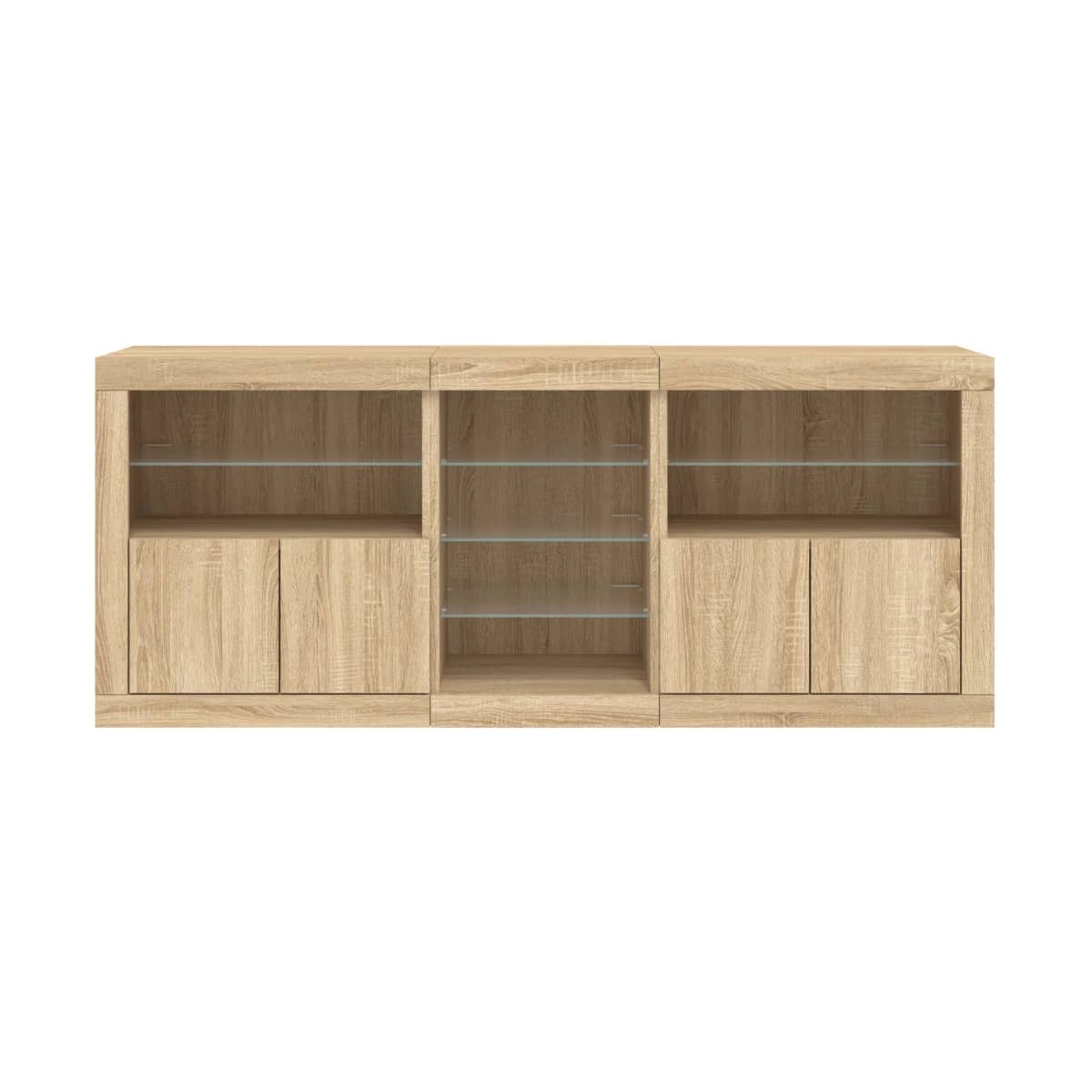 Decora el salón con este moderno aparador con luces LED, que combina fácilmente con muebles de cualquier estilo. Material duradero: La madera de ingeniería tiene una calidad excepcional, con una superficie lisa y también cuenta con fuerza, estabilidad y resistencia a la humedad.Luces LED RGB: El armario buffet está equipado con brillantes luces LED RGB. Con diversos menús personalizables, puedes cambiar el color de las luces sin problemas e incluso hacer que se ajusten automáticamente. Estas luces LED no sólo realzan el aspecto moderno del aparador, sino que también le dan un toque de moda.Amplio espacio de almacenaje: El armario de almacenaje ofrece mucho espacio para guardar a mano y en orden los artículos cotidianos.Función expositora: La resistente superficie del mueble de recibidor es ideal para exponer objetos decorativos, marcos de fotos o plantas.Puertas prácticas: Mantén tus cosas sin polvo ocultándolas tras las puertas del armario auxiliar. Información útil:El producto tiene un conector USB que necesita una fuente de alimentación USB certificada de 5 V (no incluida). Advertencia:Para evitar que vuelque, este producto debe usarse con el dispositivo de fijación a la pared incluido.