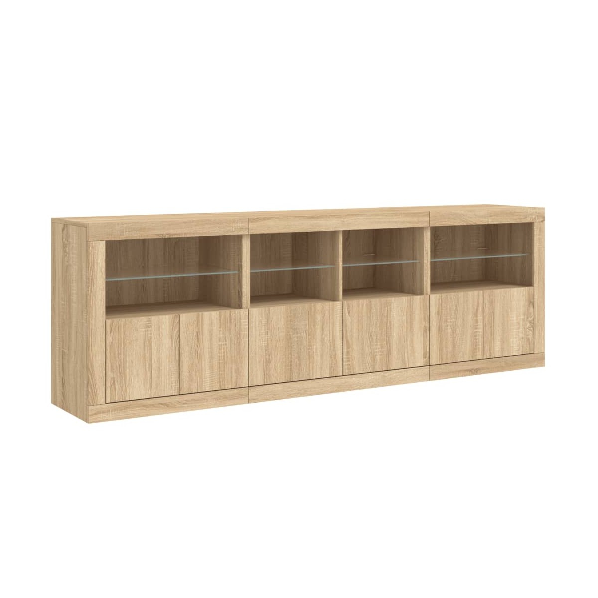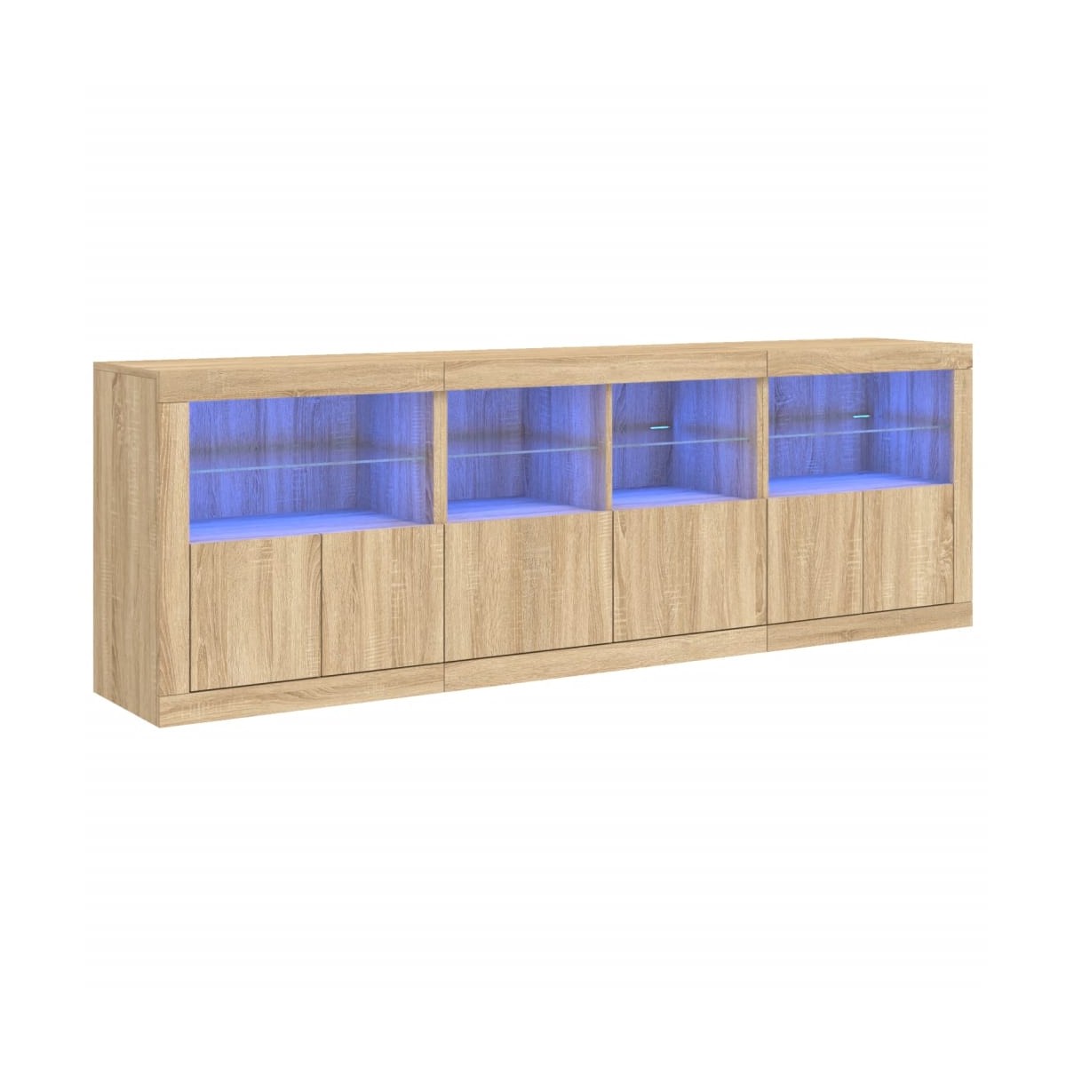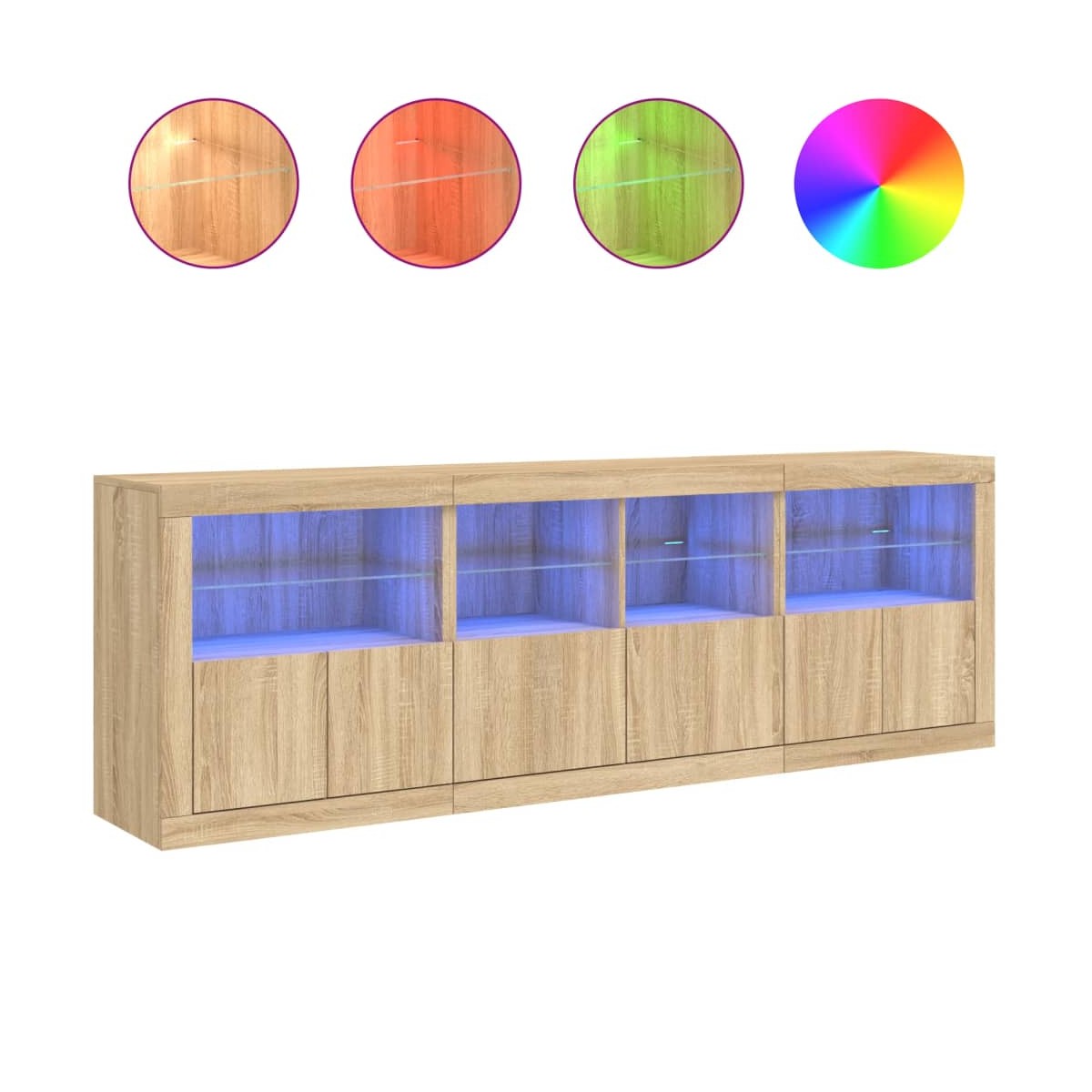 Decora el salón con este moderno aparador con luces LED, que combina fácilmente con muebles de cualquier estilo. Material duradero: La madera de ingeniería tiene una calidad excepcional, con una superficie lisa y también cuenta con fuerza, estabilidad y resistencia a la humedad.Luces LED RGB: El armario buffet está equipado con brillantes luces LED RGB. Con diversos menús personalizables, puedes cambiar el color de las luces sin problemas e incluso hacer que se ajusten automáticamente. Estas luces LED no sólo realzan el aspecto moderno del aparador, sino que también le dan un toque de moda.Amplio espacio de almacenaje: El armario de almacenaje ofrece mucho espacio para guardar a mano y en orden los artículos cotidianos.Función expositora: La resistente superficie del mueble de recibidor es ideal para exponer objetos decorativos, marcos de fotos o plantas.Puertas prácticas: Mantén tus cosas sin polvo ocultándolas tras las puertas del armario auxiliar. Información útil:El producto tiene un conector USB que necesita una fuente de alimentación USB certificada de 5 V (no incluida). Advertencia:Para evitar que vuelque, este producto debe usarse con el dispositivo de fijación a la pared incluido.