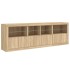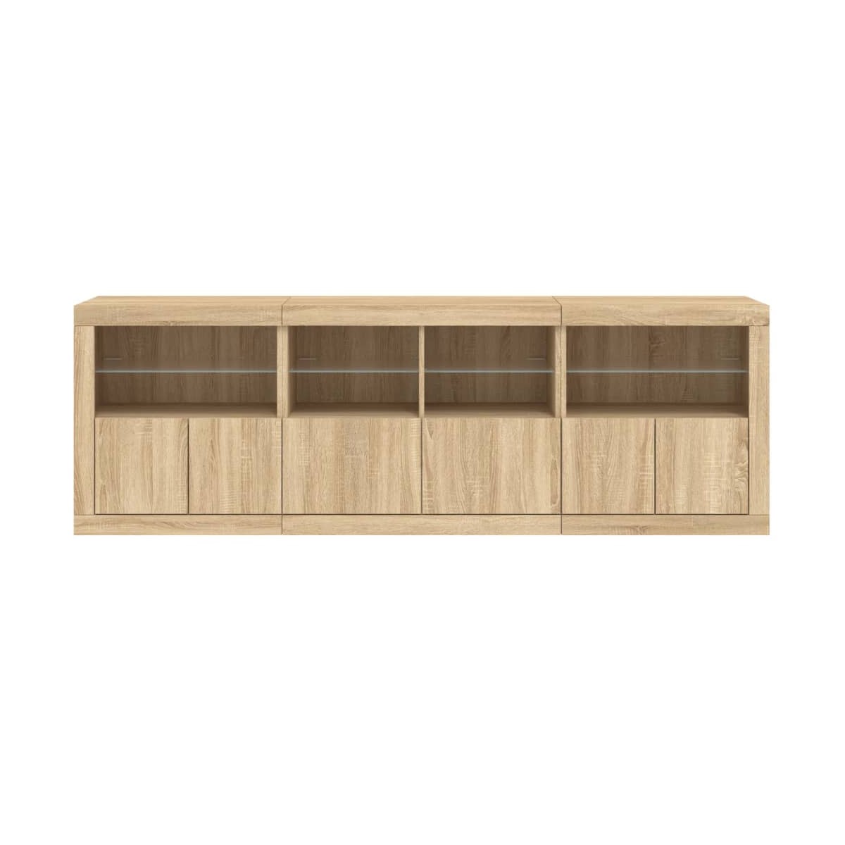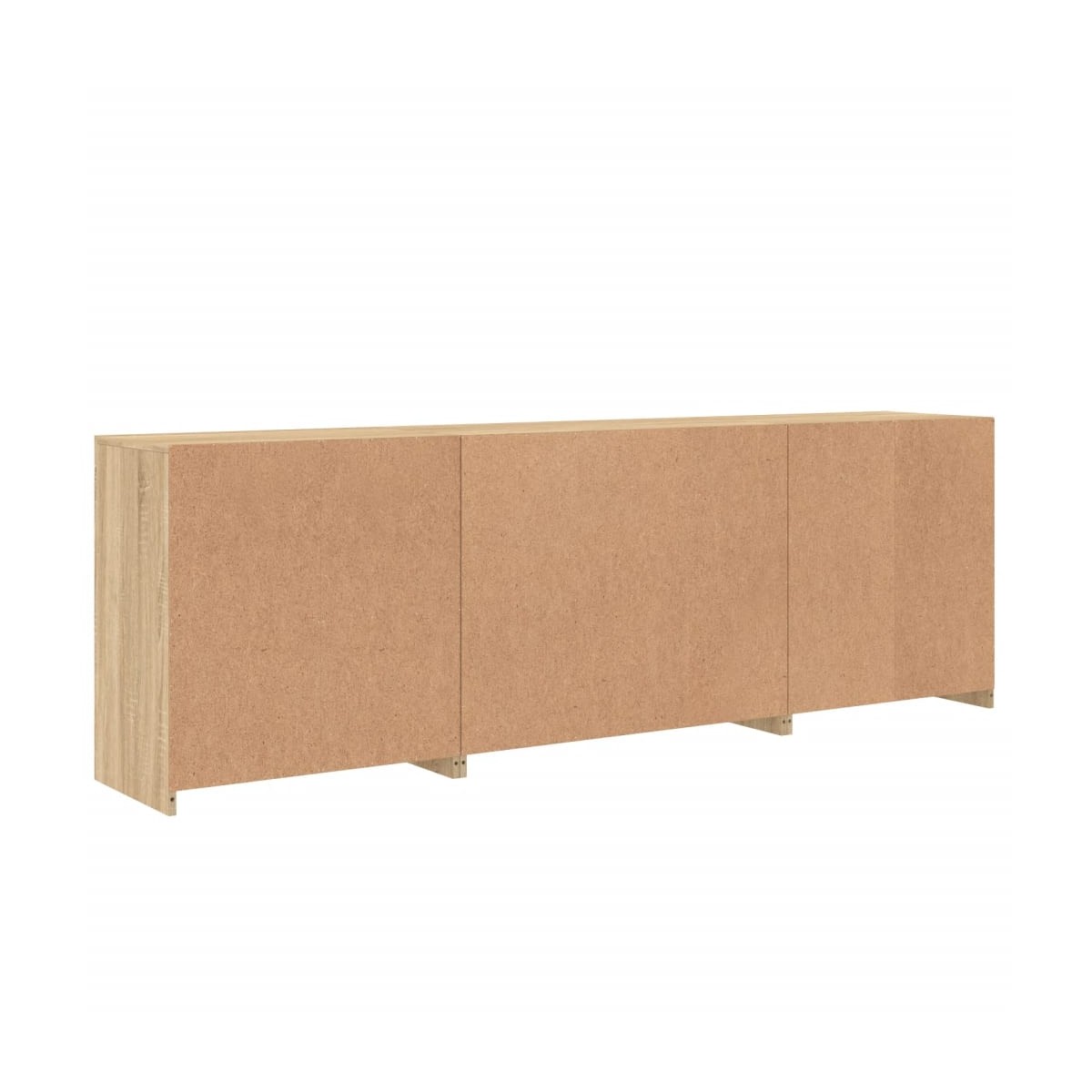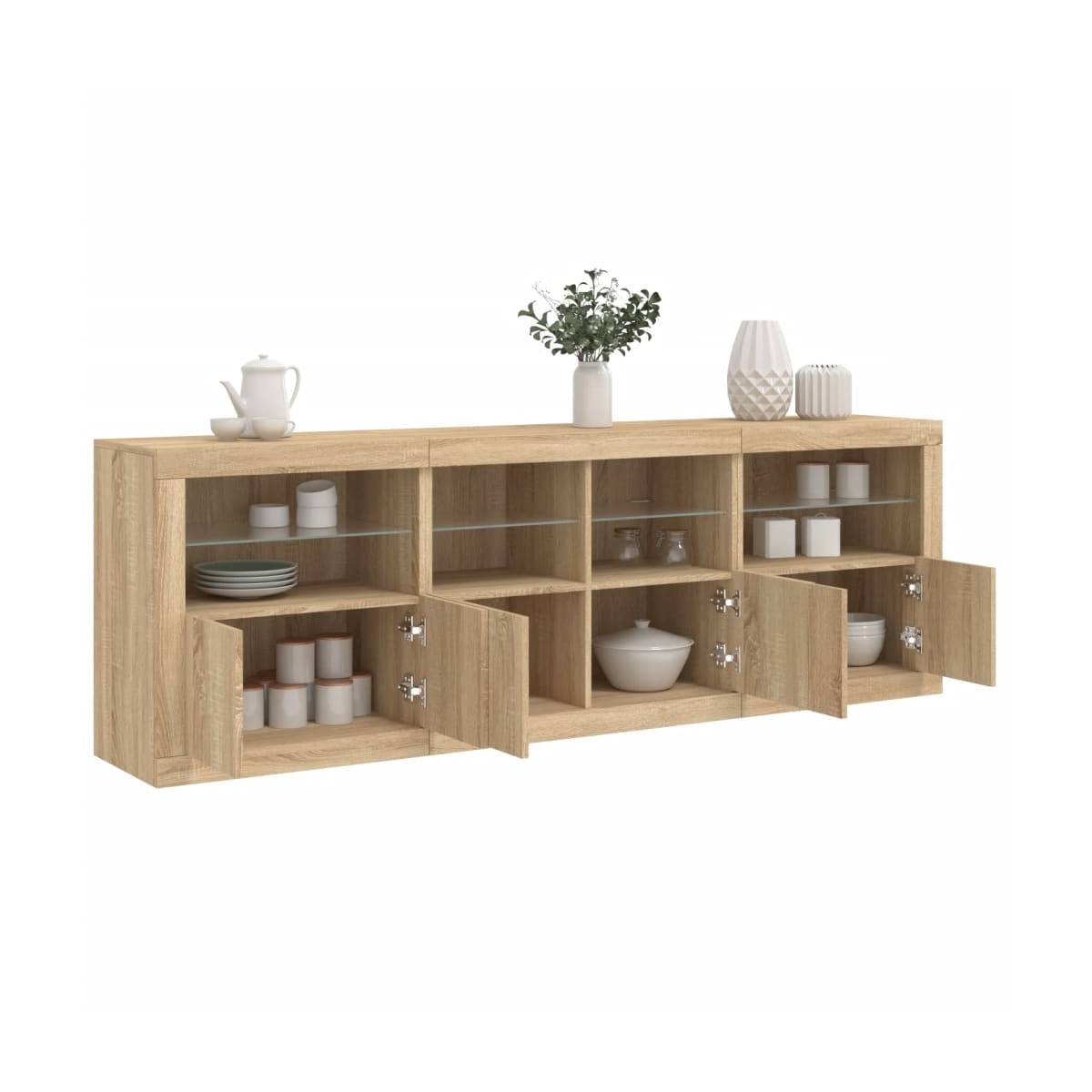 Decora el salón con este moderno aparador con luces LED, que combina fácilmente con muebles de cualquier estilo. Material duradero: La madera de ingeniería tiene una calidad excepcional, con una superficie lisa y también cuenta con fuerza, estabilidad y resistencia a la humedad.Luces LED RGB: El armario buffet está equipado con brillantes luces LED RGB. Con diversos menús personalizables, puedes cambiar el color de las luces sin problemas e incluso hacer que se ajusten automáticamente. Estas luces LED no sólo realzan el aspecto moderno del aparador, sino que también le dan un toque de moda.Amplio espacio de almacenaje: El armario de almacenaje ofrece mucho espacio para guardar a mano y en orden los artículos cotidianos.Función expositora: La resistente superficie del mueble de recibidor es ideal para exponer objetos decorativos, marcos de fotos o plantas.Puertas prácticas: Mantén tus cosas sin polvo ocultándolas tras las puertas del armario auxiliar. Información útil:El producto tiene un conector USB que necesita una fuente de alimentación USB certificada de 5 V (no incluida). Advertencia:Para evitar que vuelque, este producto debe usarse con el dispositivo de fijación a la pared incluido.