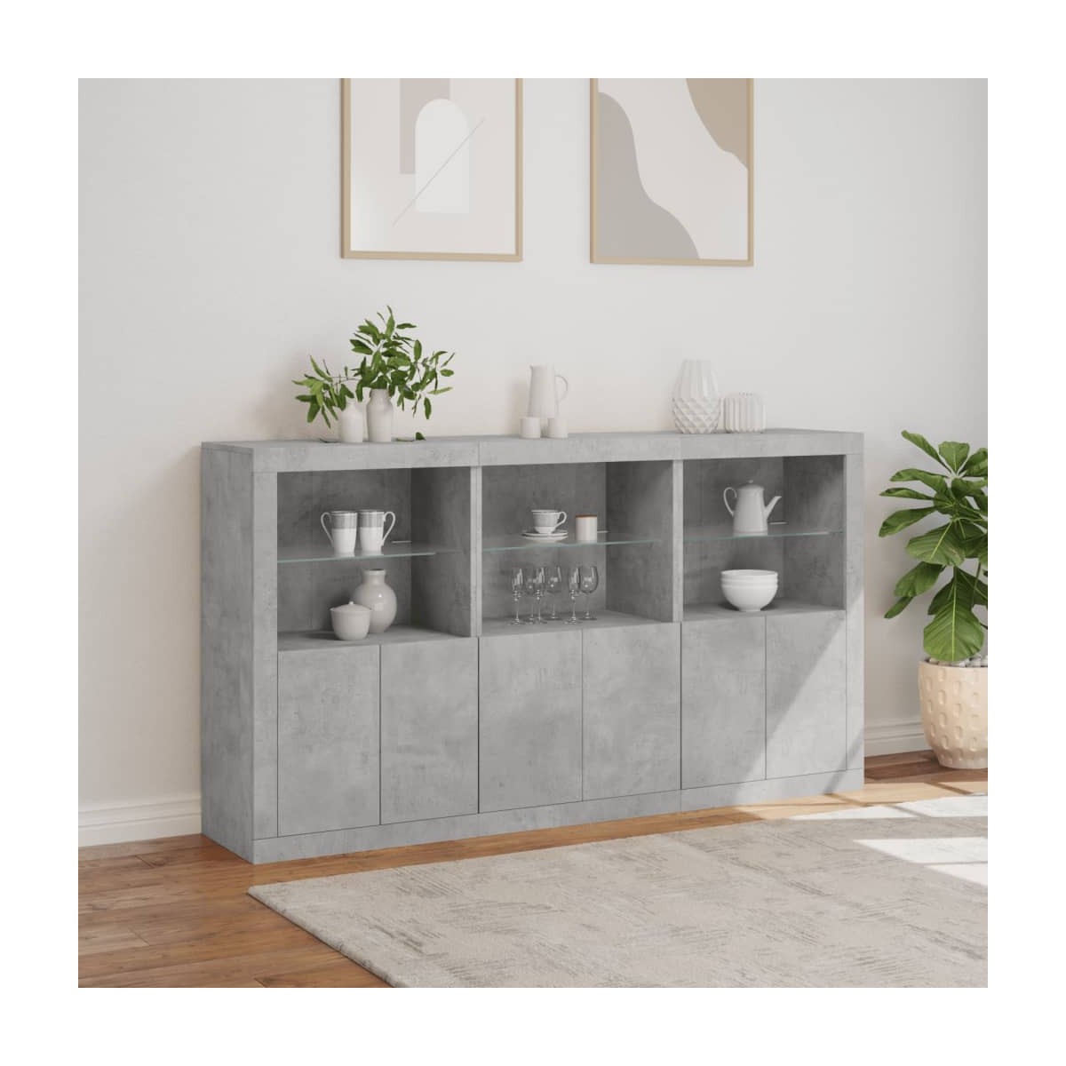 Decora el salón con este moderno aparador con luces LED, que combina fácilmente con muebles de cualquier estilo. Material duradero: La madera de ingeniería tiene una calidad excepcional, con una superficie lisa y también cuenta con fuerza, estabilidad y resistencia a la humedad.Luces LED RGB: El armario buffet está equipado con brillantes luces LED RGB. Con diversos menús personalizables, puedes cambiar el color de las luces sin problemas e incluso hacer que se ajusten automáticamente. Estas luces LED no sólo realzan el aspecto moderno del aparador, sino que también le dan un toque de moda.Amplio espacio de almacenaje: El armario de almacenaje ofrece mucho espacio para guardar a mano y en orden los artículos cotidianos.Función expositora: La resistente superficie del mueble de recibidor es ideal para exponer objetos decorativos, marcos de fotos o plantas.Puertas prácticas: Mantén tus cosas sin polvo ocultándolas tras las puertas del armario auxiliar. Información útil:El producto tiene un conector USB que necesita una fuente de alimentación USB certificada de 5 V (no incluida). Advertencia:Para evitar que vuelque, este producto debe usarse con el dispositivo de fijación a la pared incluido.