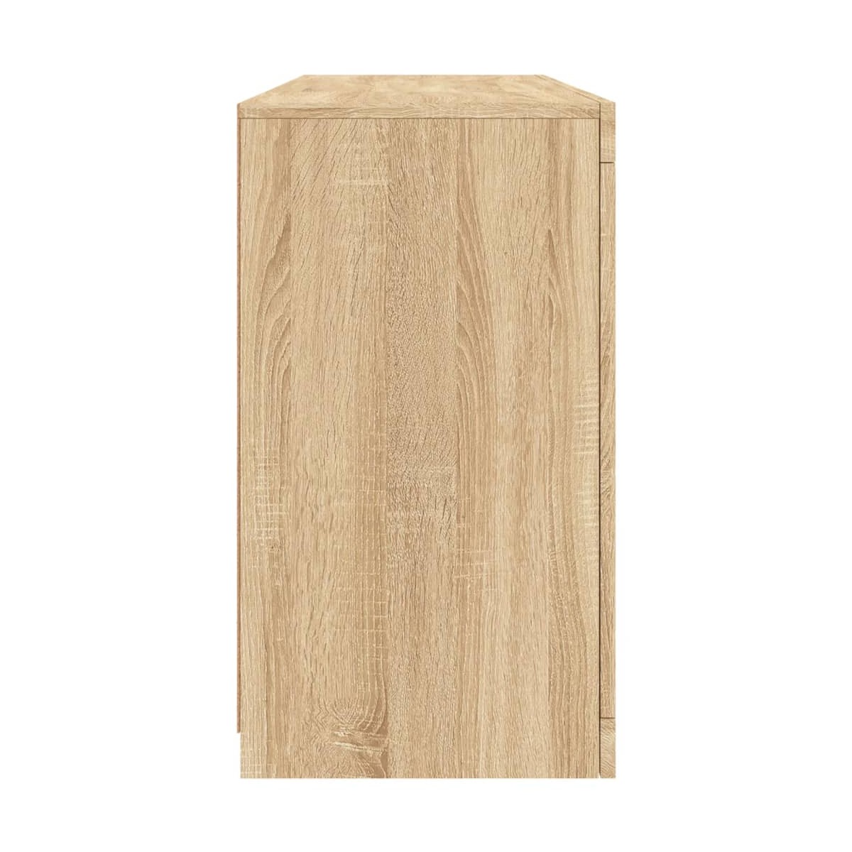 Decora el salón con este moderno aparador con luces LED, que combina fácilmente con muebles de cualquier estilo. Material duradero: La madera de ingeniería tiene una calidad excepcional, con una superficie lisa y también cuenta con fuerza, estabilidad y resistencia a la humedad.Luces LED RGB: El armario buffet está equipado con brillantes luces LED RGB. Con diversos menús personalizables, puedes cambiar el color de las luces sin problemas e incluso hacer que se ajusten automáticamente. Estas luces LED no sólo realzan el aspecto moderno del aparador, sino que también le dan un toque de moda.Amplio espacio de almacenaje: El armario de almacenaje ofrece mucho espacio para guardar a mano y en orden los artículos cotidianos.Función expositora: La resistente superficie del mueble de recibidor es ideal para exponer objetos decorativos, marcos de fotos o plantas.Puertas prácticas: Mantén tus cosas sin polvo ocultándolas tras las puertas del armario auxiliar. Información útil:El producto tiene un conector USB que necesita una fuente de alimentación USB certificada de 5 V (no incluida). Advertencia:Para evitar que vuelque, este producto debe usarse con el dispositivo de fijación a la pared incluido.
