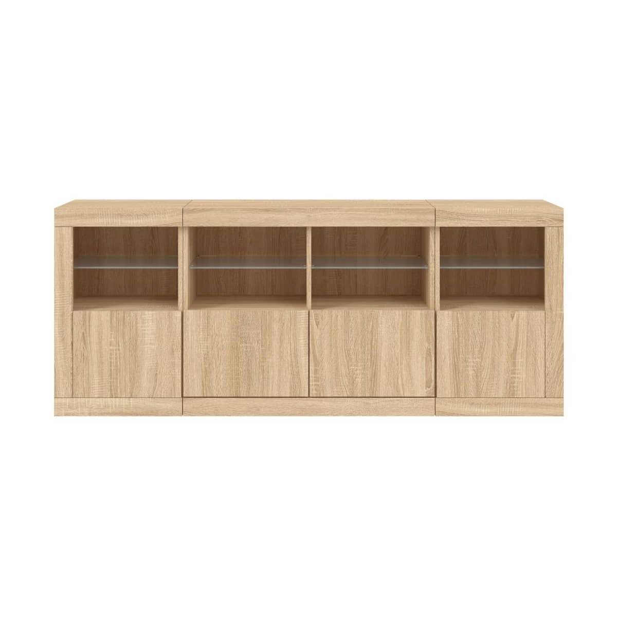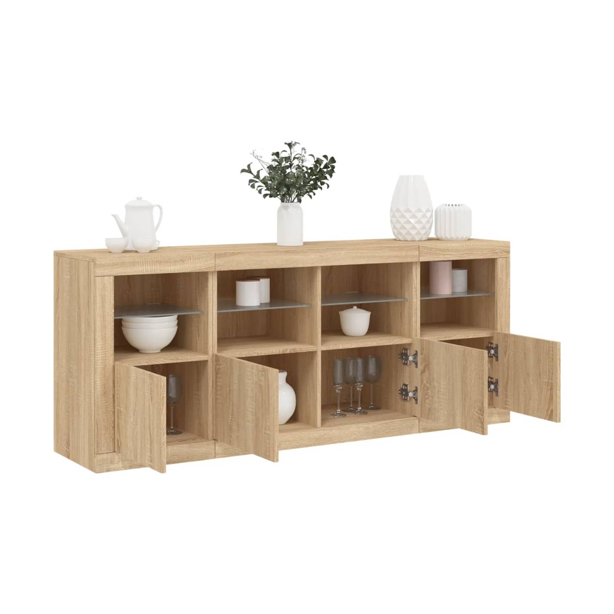 Decora el salón con este moderno aparador con luces LED, que combina fácilmente con muebles de cualquier estilo. Material duradero: La madera de ingeniería tiene una calidad excepcional, con una superficie lisa y también cuenta con fuerza, estabilidad y resistencia a la humedad.Luces LED RGB: El armario buffet está equipado con brillantes luces LED RGB. Con diversos menús personalizables, puedes cambiar el color de las luces sin problemas e incluso hacer que se ajusten automáticamente. Estas luces LED no sólo realzan el aspecto moderno del aparador, sino que también le dan un toque de moda.Amplio espacio de almacenaje: El armario de almacenaje ofrece mucho espacio para guardar a mano y en orden los artículos cotidianos.Función expositora: La resistente superficie del mueble de recibidor es ideal para exponer objetos decorativos, marcos de fotos o plantas.Puertas prácticas: Mantén tus cosas sin polvo ocultándolas tras las puertas del armario auxiliar. Información útil:El producto tiene un conector USB que necesita una fuente de alimentación USB certificada de 5 V (no incluida). Advertencia:Para evitar que vuelque, este producto debe usarse con el dispositivo de fijación a la pared incluido.