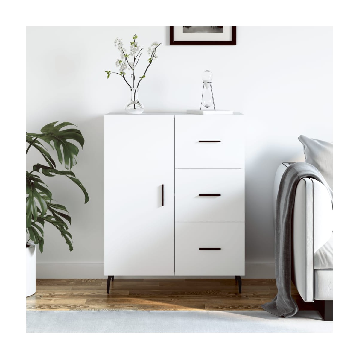 Este aparador clásico tiene un look atemporal, lo que lo convierte en un complemento perfecto para tu hogar. Material robusto: La madera contrachapada tiene una calidad excepcional, con una superficie lisa y también cuenta con fuerza, estabilidad y resistencia a la humedad.Amplio espacio de almacenaje: Con 3 cajones y 2 compartimentos detrás de la puerta, el aparador ofrece un amplio espacio para mantener tus cosas organizadas y al alcance.Función expositora: La resistente superficie de este armario es ideal para colocar artículos decorativos, marcos de fotos y plantas.Puerta práctica: Evita que tus cosas se llenen de polvo ocultándolas detrás de la puerta del mueble de almacenaje.Patas de metal: Las patas metálicas añaden un estilo tranquilo a la casa a la vez que garantizan la estabilidad. Advertencia:Para evitar que vuelque, este producto debe usarse con el dispositivo de fijación a la pared incluido.