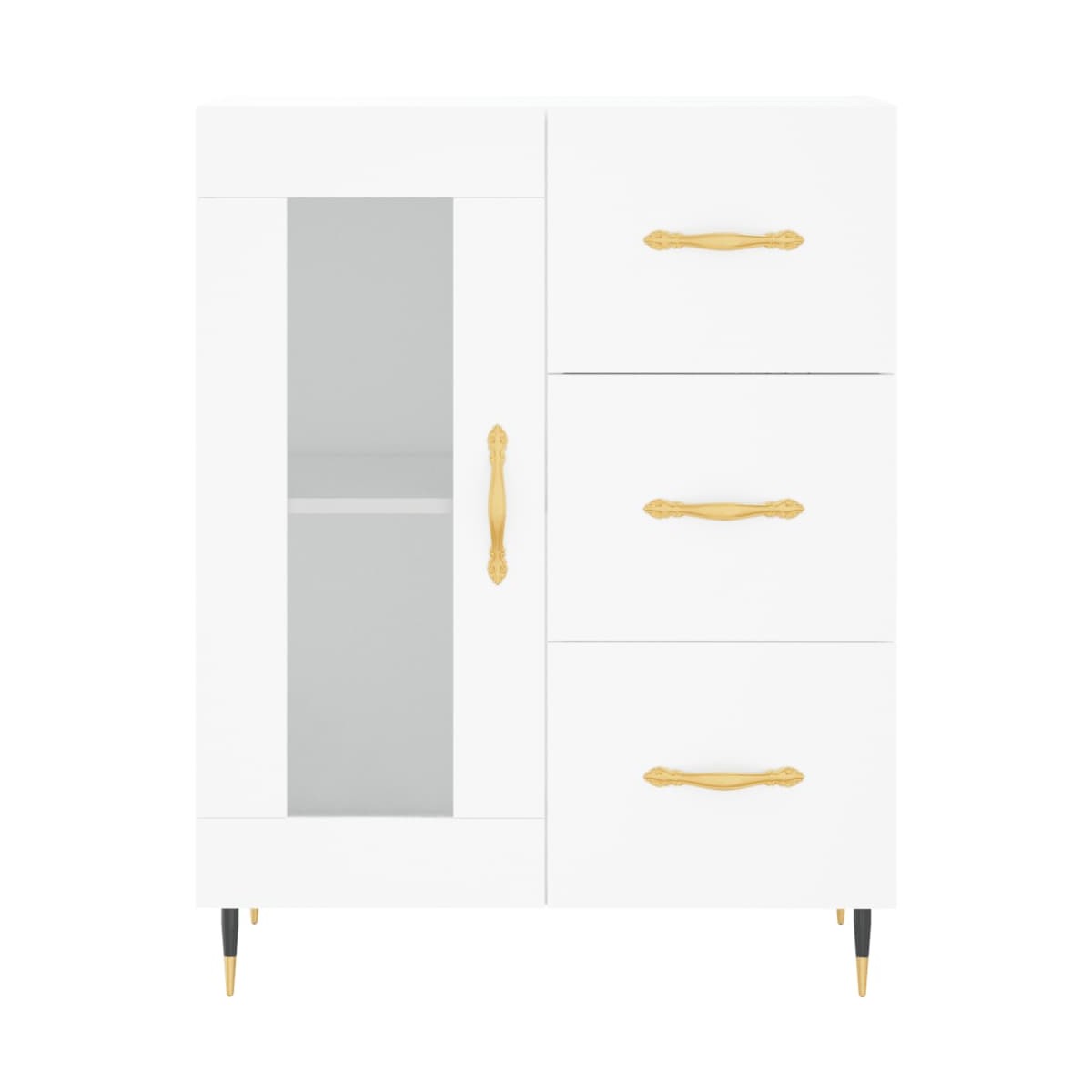 Este aparador clásico tiene un look atemporal, lo que lo convierte en un complemento perfecto para tu hogar. Material robusto: La madera contrachapada tiene una calidad excepcional, con una superficie lisa y también cuenta con fuerza, estabilidad y resistencia a la humedad.Amplio espacio de almacenaje: Con 3 cajones y 2 compartimentos detrás de la puerta de vidrio, el aparador ofrece un amplio espacio para mantener tus cosas organizadas y al alcance.Función expositora: La resistente superficie de este armario es ideal para colocar artículos decorativos, marcos de fotos y plantas.Puerta práctica: Evita que tus cosas se llenen de polvo ocultándolas detrás de la puerta del mueble de almacenaje.Patas de metal: Las patas metálicas añaden un estilo tranquilo a la casa a la vez que garantizan la estabilidad. Advertencia:Para evitar que vuelque, este producto debe usarse con el dispositivo de fijación a la pared incluido.