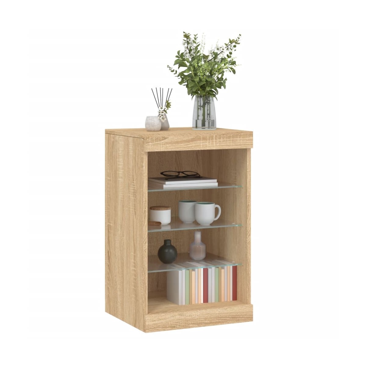 Decora el salón con este moderno aparador con luces LED, que combina fácilmente con muebles de cualquier estilo. Material duradero: La madera de ingeniería tiene una calidad excepcional, con una superficie lisa y también cuenta con fuerza, estabilidad y resistencia a la humedad.Amplio espacio de almacenaje: Este aparador ofrece un amplio espacio de almacenaje para mantener bien organizados y a mano revistas, libros, mandos a distancia y otros objetos pequeños.Función expositora: La resistente superficie del aparador es ideal para exponer objetos decorativos, marcos de fotos o plantas en macetas.Luces LED ajustables: Este armario de almacenaje está equipado con luces LED RGB, que tiene diferentes menús para cambiar el color de la luz y ajustarlo automáticamente, con el fin de que la decoración de la casa sea colorida y bonita. Advertencia:Para evitar que vuelque, este producto debe usarse con el dispositivo de fijación a la pared incluido. Información útil:El producto tiene un conector USB que necesita una fuente de alimentación USB certificada de 5 V (no incluida).