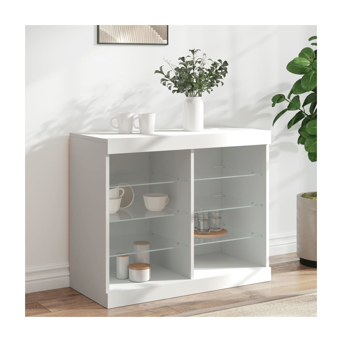 Decora el salón con este moderno aparador con luces LED, que combina fácilmente con muebles de cualquier estilo. Material duradero: La madera de ingeniería tiene una calidad excepcional, con una superficie lisa y también cuenta con fuerza, estabilidad y resistencia a la humedad.Amplio espacio de almacenaje: Este aparador ofrece un amplio espacio de almacenaje para mantener bien organizados y a mano revistas, libros, mandos a distancia y otros objetos pequeños.Función expositora: La resistente superficie del aparador es ideal para exponer objetos decorativos, marcos de fotos o plantas en macetas.Luces LED ajustables: Este armario de almacenaje está equipado con luces LED RGB, que tiene diferentes menús para cambiar el color de la luz y ajustarlo automáticamente, con el fin de que la decoración de la casa sea colorida y bonita. Advertencia:Para evitar que vuelque, este producto debe usarse con el dispositivo de fijación a la pared incluido. Información útil:El producto tiene un conector USB que necesita una fuente de alimentación USB certificada de 5 V (no incluida).