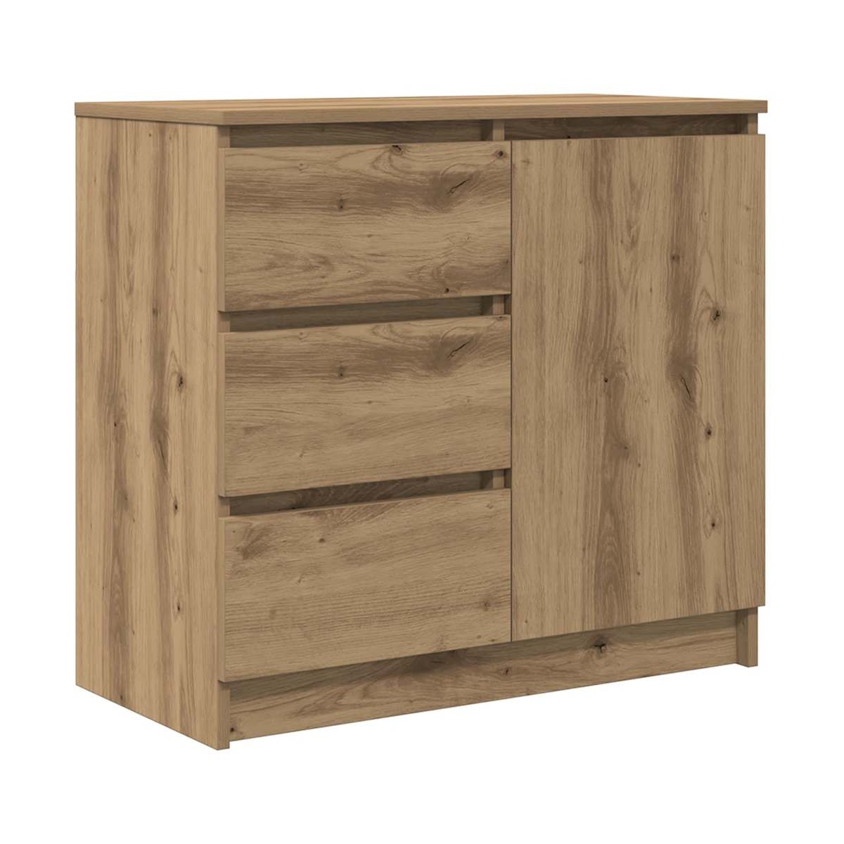 El aparador ofrece un amplio espacio de almacenamiento, lo que ayuda a mantener la habitación ordenada y organizada al tiempo que combina practicidad con estética. Material estable y duradero: La madera de ingeniería es un material duradero y estable con una superficie lisa que es resistente a la humedad, la deformación y la rotura, lo que la convierte en una opción fiable para una variedad de proyectos.Amplio espacio de almacenamiento: el armario de almacenamiento cuenta con una puerta y tres cajones, lo que garantiza que sus artículos estén bien organizados y ordenados. La puerta del armario proporciona un espacio de almacenamiento cerrado para mantener sus pertenencias protegidas y fuera de la vista, mientras que los cajones ofrecen espacio adicional para acceder fácilmente a varios artículos. Un estante interior ayuda a clasificar sus pertenencias, lo que mejora la organización y la limpieza.Uso versátil: el aparador es perfecto para cualquier habitación, ya sea como una elegante solución de almacenamiento en la sala de estar, un complemento funcional para el comedor o un práctico organizador en la oficina en casa. Su diseño adaptable complementa varios estilos, lo que lo convierte en una excelente opción para guardar libros, ropa de cama o material de oficina y, al mismo tiempo, mejorar el espacio.Instalación personalizable: el aparador se puede montar en dos configuraciones, lo que permite colocar el cajón y la puerta pequeña en el lado derecho o izquierdo, y la puerta más grande en el lado correspondiente. Esta flexibilidad garantiza que se adapte a sus necesidades y preferencias específicas.Fácil de mantener: Gracias a su superficie lisa, el mueble de pasillo es fácil de limpiar con un paño húmedo y requiere menos mantenimiento. Advertencia:Para evitar que vuelque, este producto debe usarse con el dispositivo de fijación a la pared suministrado.