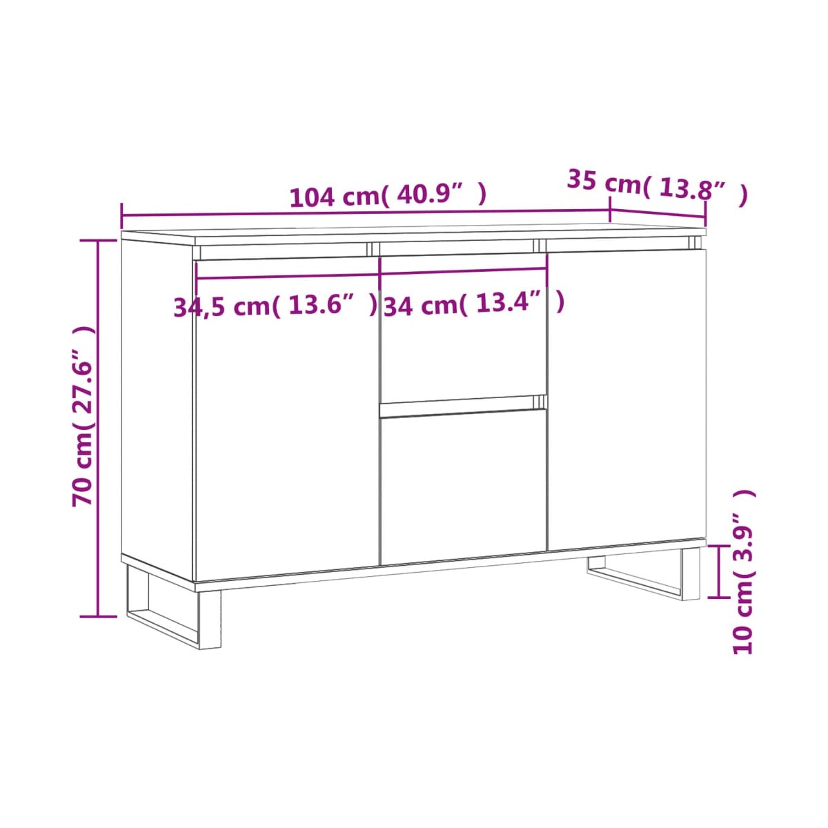 Este aparador de moda, con un aspecto atemporal, está destinado a ser un excelente complemento para la casa. Material duradero: La madera de ingeniería tiene una calidad excepcional, con una superficie lisa y también cuenta con fuerza, estabilidad y resistencia a la humedad. Hecho de madera de ingeniería, el armario de almacenaje es fácil de limpiar con un paño húmedo.Amplio espacio de almacenaje: El aparador ofrece un amplio espacio de almacenaje para mantener tus cosas bien organizadas y al alcance.Función expositora: La superficie del aparador es perfecta para exponer los objetos decorativos, marcos de fotos y plantas.Patas de hierro: Las patas de hierro del armario auxiliar garantizan su solidez y estabilidad. Advertencia:Para evitar que vuelque, este producto debe usarse con el dispositivo de fijación a la pared incluido.