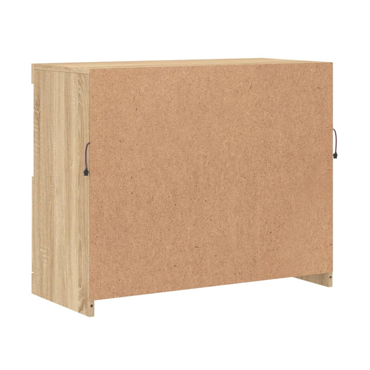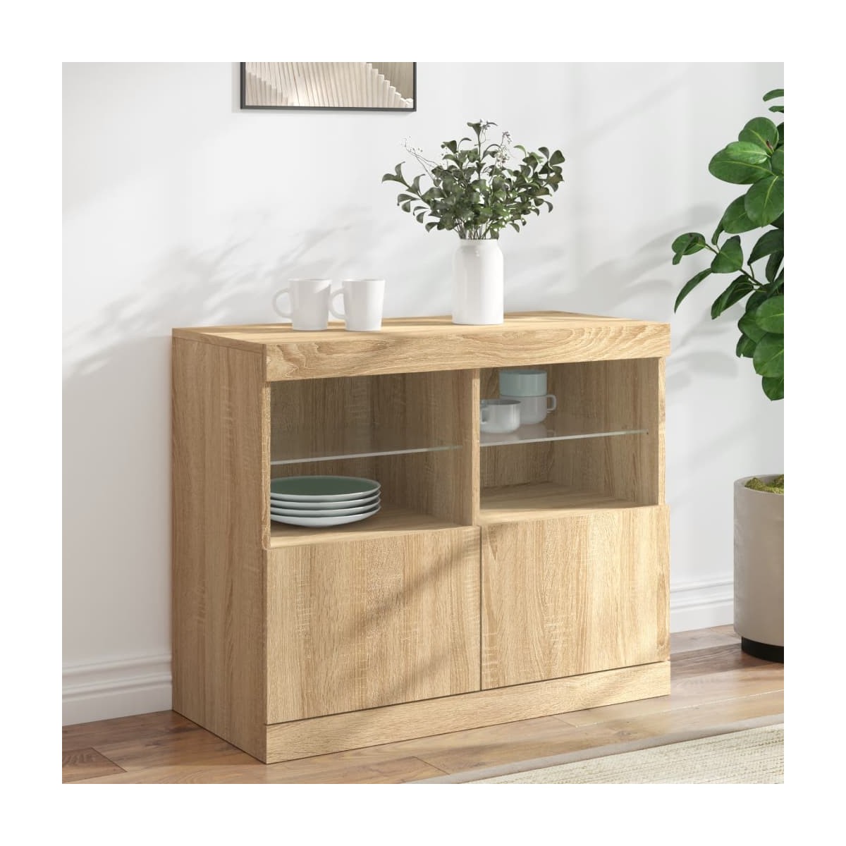 Decora el salón con este moderno aparador con luces LED, que combina fácilmente con muebles de cualquier estilo. Material duradero: La madera de ingeniería tiene una calidad excepcional, con una superficie lisa y también cuenta con fuerza, estabilidad y resistencia a la humedad.Amplio espacio de almacenaje: Este aparador ofrece un amplio espacio de almacenaje para mantener bien organizados y a mano revistas, libros, mandos a distancia y otros objetos pequeños.Función expositora: La resistente superficie del aparador es ideal para exponer objetos decorativos, marcos de fotos o plantas en macetas.Luces LED RGB: El armario de almacenaje está equipado con vibrantes luces LED RGB. Con diversos menús personalizables, puedes cambiar sin esfuerzo el color de las luces e incluso hacer que se ajusten automáticamente. Advertencia:Para evitar que vuelque, este producto debe usarse con el dispositivo de fijación a la pared incluido. Información útil:El producto tiene un conector USB que necesita una fuente de alimentación USB certificada de 5 V (no incluida).