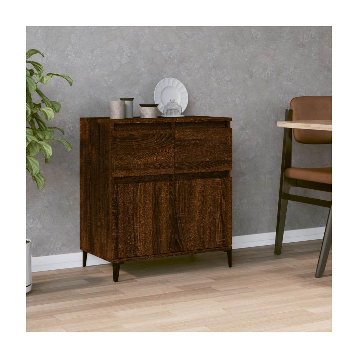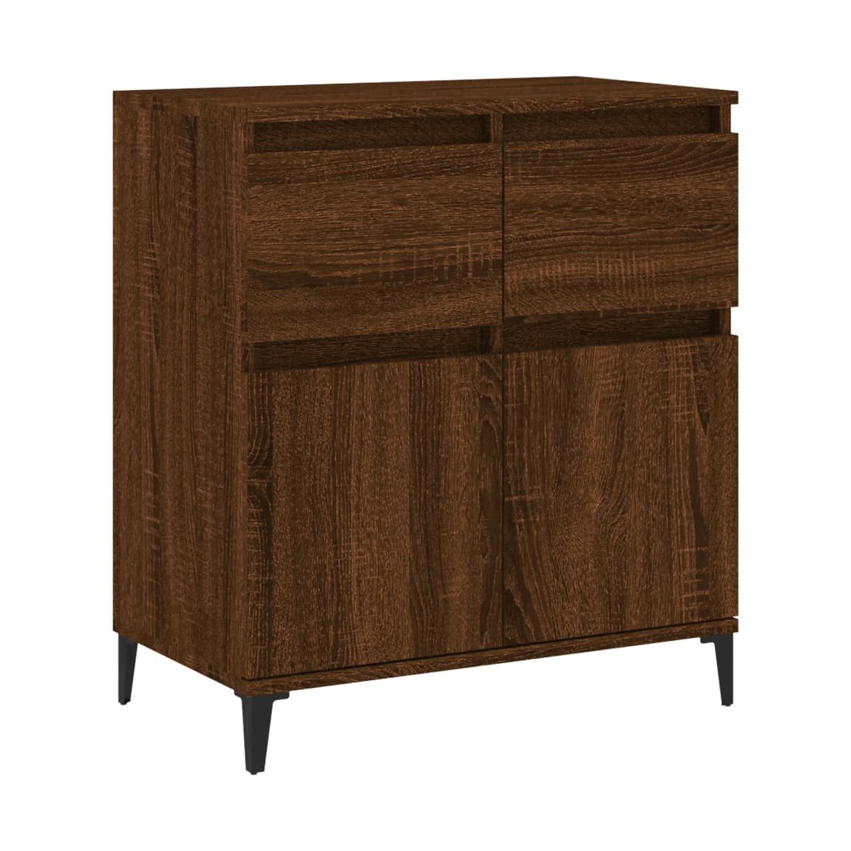 Este elegante aparador es la elección perfecta para la estancia gracias a su diseño moderno y práctico. Material duradero: La madera contrachapada tiene una calidad excepcional, con una superficie lisa, y también cuenta con fuerza, estabilidad y resistencia a la humedad.Patas de metal: Las patas de metal ofrecen solidez y estabilidad al aparador.Amplio espacio de almacenaje: Este armario posee 2 cajones y 2 compartimentos con puertas para tener tus cosas organizadas y al alcance.Amplios usos: Puedes utilizar este armario auxiliar en la cocina o el baño, o incluso como armario de almacenaje en dormitorios, aseos, entradas, pasillos, oficinas, comedores y otras zonas de la casa. Información útil:Para facilitar al máximo el montaje, cada producto se entrega con un manual. Advertencia:Para evitar que vuelque, este producto debe usarse con el dispositivo de fijación a la pared incluido.