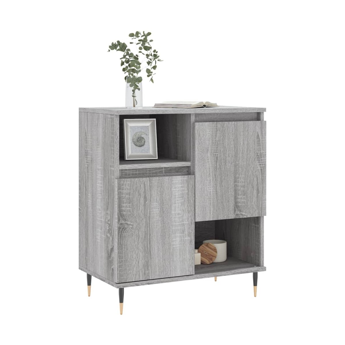 Este aparador de moda, con un aspecto atemporal, está destinado a ser un excelente complemento para la casa. Material duradero: La madera de ingeniería tiene una calidad excepcional, con una superficie lisa y también cuenta con fuerza, estabilidad y resistencia a la humedad. Hecho de madera de ingeniería, el armario de almacenaje es fácil de limpiar con un paño húmedo.Amplio espacio de almacenaje: El aparador ofrece un amplio espacio de almacenaje para mantener tus cosas bien organizadas y al alcance.Función expositora: La superficie del aparador es perfecta para exponer los objetos decorativos, marcos de fotos y plantas.Patas de hierro: Las patas de hierro del armario auxiliar garantizan su solidez y estabilidad. Advertencia:Para evitar que vuelque, este producto debe usarse con el dispositivo de fijación a la pared incluido.