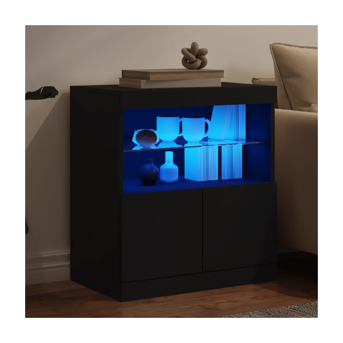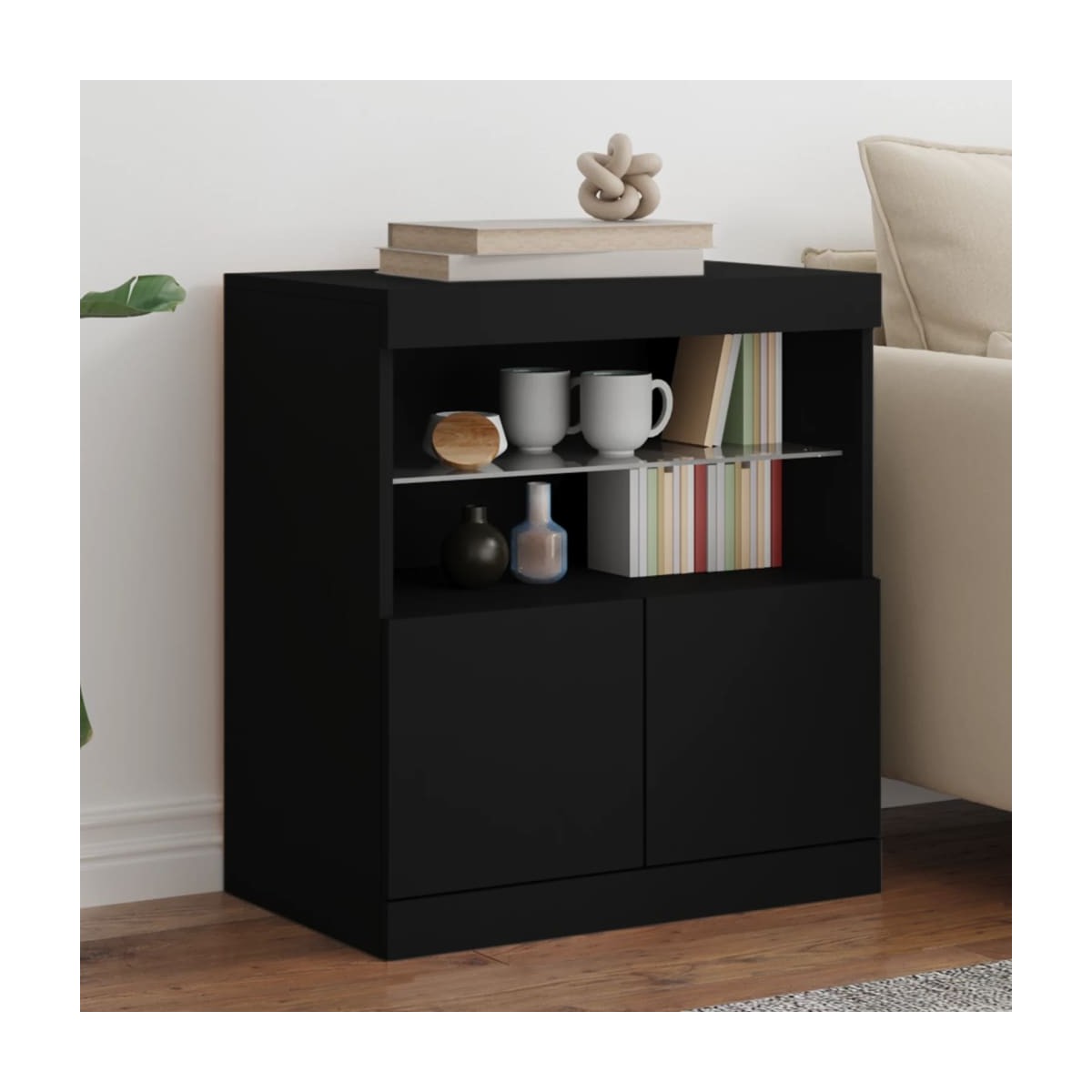 Decora el salón con este moderno aparador con luces LED, que combina fácilmente con muebles de cualquier estilo. Material duradero: La madera de ingeniería tiene una calidad excepcional, con una superficie lisa y también cuenta con fuerza, estabilidad y resistencia a la humedad.Amplio espacio de almacenaje: Este aparador ofrece un amplio espacio de almacenaje para mantener bien organizados y a mano revistas, libros, mandos a distancia y otros objetos pequeños.Función expositora: La resistente superficie del aparador es ideal para exponer objetos decorativos, marcos de fotos o plantas en macetas.Luces LED RGB: El armario de almacenaje está equipado con vibrantes luces LED RGB. Con diversos menús personalizables, puedes cambiar sin esfuerzo el color de las luces e incluso hacer que se ajusten automáticamente. Advertencia:Para evitar que vuelque, este producto debe usarse con el dispositivo de fijación a la pared incluido. Información útil:El producto tiene un conector USB que necesita una fuente de alimentación USB certificada de 5 V (no incluida).