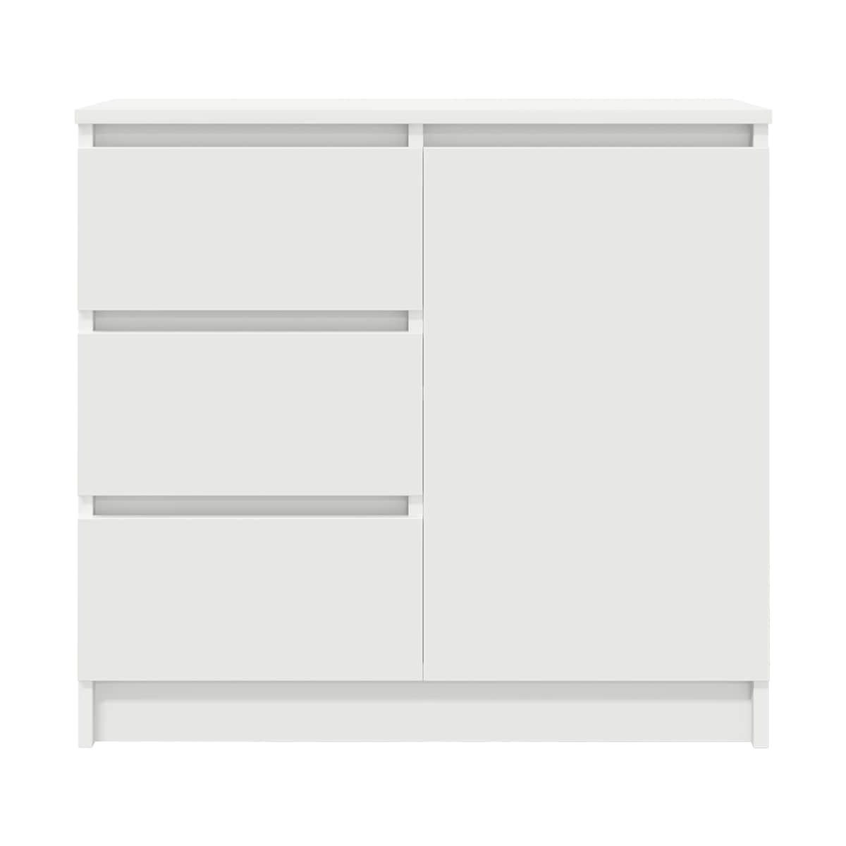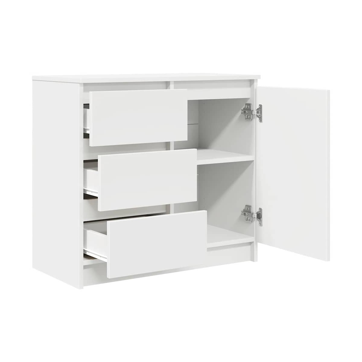 El aparador ofrece un amplio espacio de almacenamiento, lo que ayuda a mantener la habitación ordenada y organizada al tiempo que combina practicidad con estética. Material estable y duradero: La madera de ingeniería es un material duradero y estable con una superficie lisa que es resistente a la humedad, la deformación y la rotura, lo que la convierte en una opción fiable para una variedad de proyectos.Amplio espacio de almacenamiento: el armario de almacenamiento cuenta con una puerta y tres cajones, lo que garantiza que sus artículos estén bien organizados y ordenados. La puerta del armario proporciona un espacio de almacenamiento cerrado para mantener sus pertenencias protegidas y fuera de la vista, mientras que los cajones ofrecen espacio adicional para acceder fácilmente a varios artículos. Un estante interior ayuda a clasificar sus pertenencias, lo que mejora la organización y la limpieza.Uso versátil: el aparador es perfecto para cualquier habitación, ya sea como una elegante solución de almacenamiento en la sala de estar, un complemento funcional para el comedor o un práctico organizador en la oficina en casa. Su diseño adaptable complementa varios estilos, lo que lo convierte en una excelente opción para guardar libros, ropa de cama o material de oficina y, al mismo tiempo, mejorar el espacio.Instalación personalizable: el aparador se puede montar en dos configuraciones, lo que permite colocar el cajón y la puerta pequeña en el lado derecho o izquierdo, y la puerta más grande en el lado correspondiente. Esta flexibilidad garantiza que se adapte a sus necesidades y preferencias específicas.Fácil de mantener: Gracias a su superficie lisa, el mueble de pasillo es fácil de limpiar con un paño húmedo y requiere menos mantenimiento. Advertencia:Para evitar que vuelque, este producto debe usarse con el dispositivo de fijación a la pared suministrado.