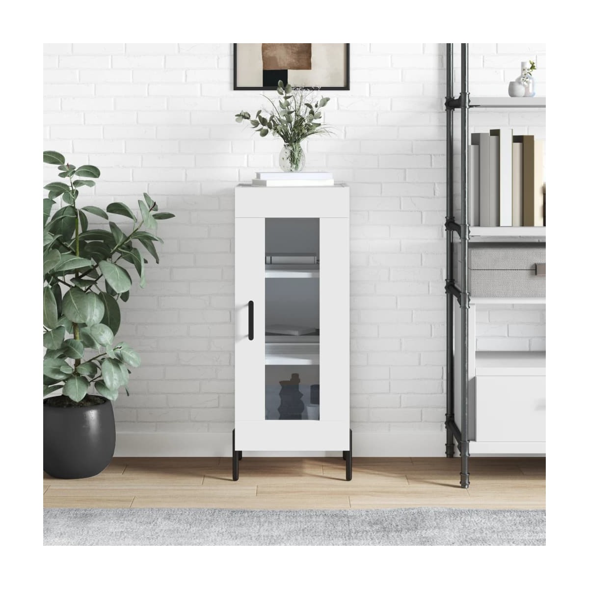 Este aparador clásico, con un aspecto atemporal, está pensado para ser un excelente aporte a tu hogar. Material duradero: La madera contrachapada tiene una calidad excepcional, con una superficie lisa y también cuenta con fuerza, estabilidad y resistencia a la humedad.Amplio espacio de almacenaje: El armario ofrece un amplio espacio de almacenamiento para mantener tus diversos artículos de uso diario bien organizados y al alcance.Función expositora: También puedes colocar tus fotos favoritas, adornos o flores en la superficie de este mueble de almacenaje para alegrarte la vida.Diseño práctico: El armario cuenta con una puerta de vidrio, que te permite ver los objetos con claridad y encontrarlos fácilmente. Advertencia:Para evitar que vuelque, este producto debe usarse con el dispositivo de fijación a la pared incluido.
