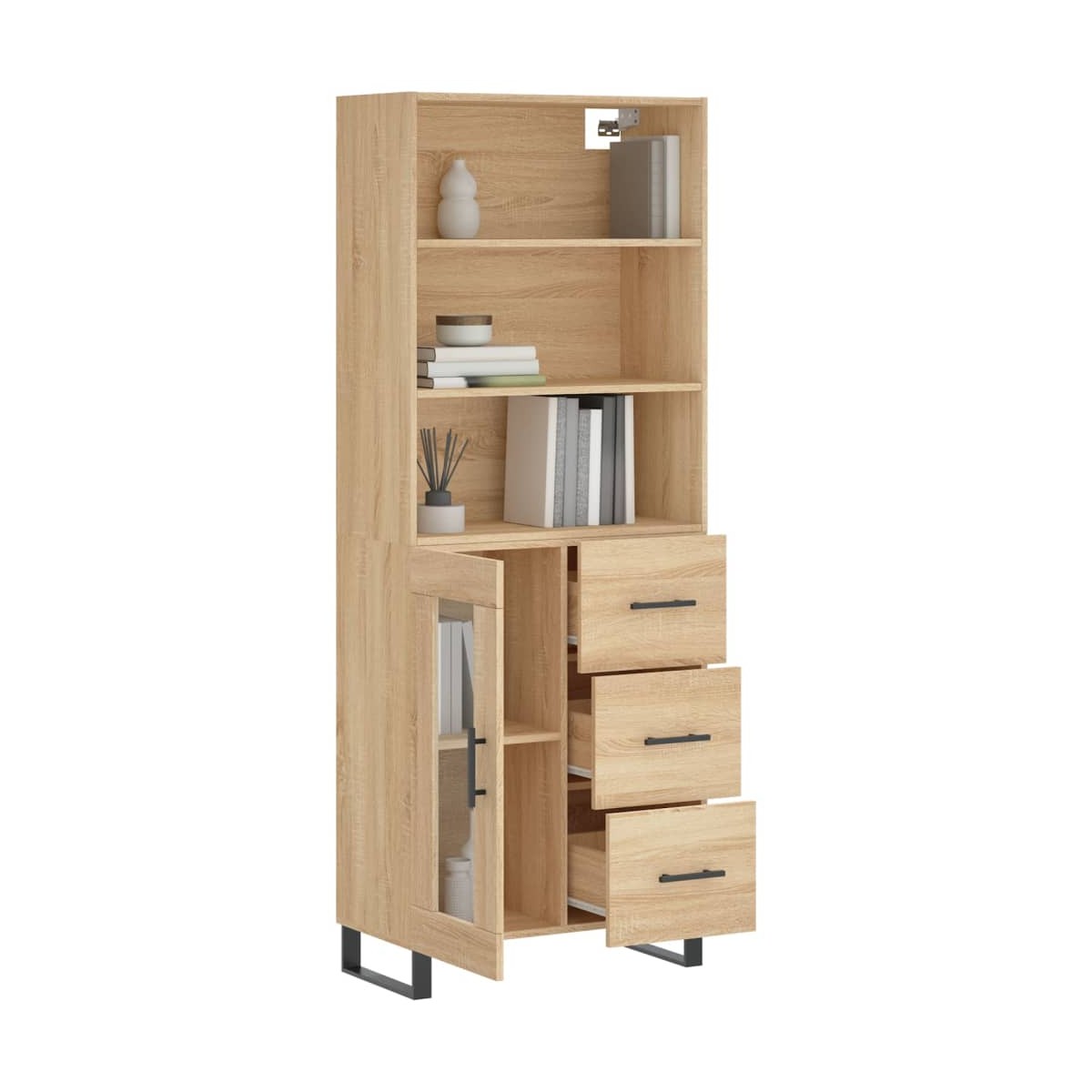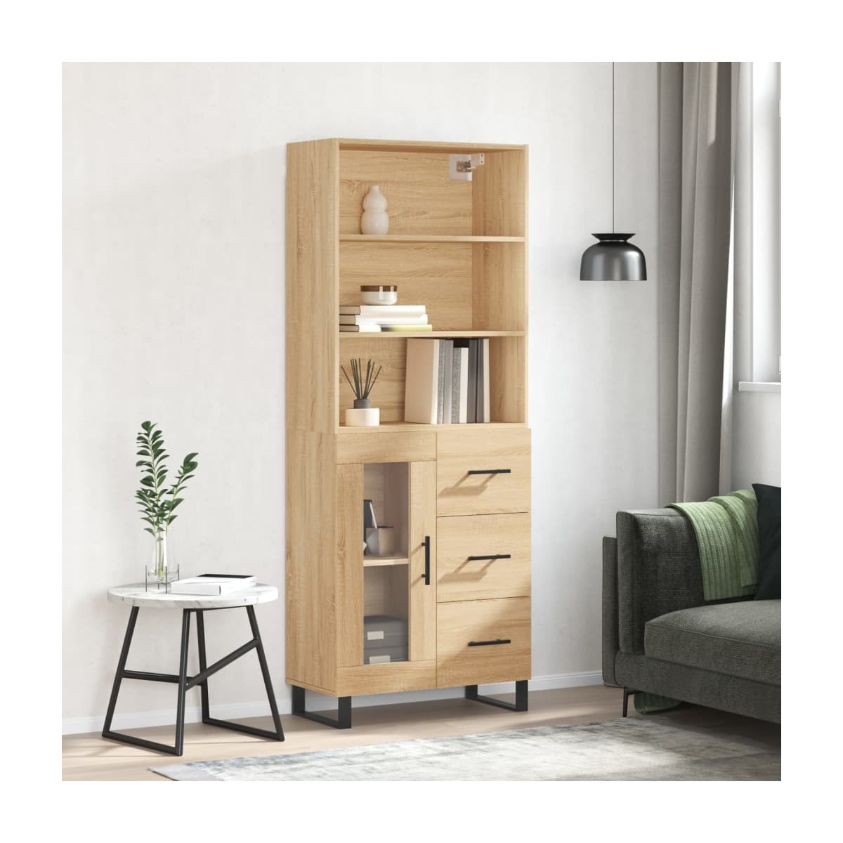 ¿Buscas un aparador elegante? ¡Este armario alto da un toque elegante a la decoración de la casa! Material duradero: La madera contrachapada tiene una calidad excepcional, con una superficie lisa y también cuenta con fuerza, estabilidad y resistencia a la humedad.Amplio espacio de almacenamiento: El mueble ofrece un amplio espacio de almacenaje para mantener tus diversos artículos de uso diario bien organizados y al alcance.Puerta práctica: Mantén ordenado el espacio colocando tus cosas detrás de la puerta del mueble de almacenaje.Patas de hierro: Las patas de hierro añaden un estilo tranquilo a la casa, además de garantizar su estabilidad. Advertencia:Para evitar que vuelque, este producto debe usarse con el dispositivo de fijación a la pared incluido. Información útil:Los tornillos y los tacos para el interior de la pared no están incluidos. Recomendamos encontrar y utilizar tornillos y tacos adecuados específicamente para las paredes. Si no estás seguro, puedes consultar con un profesional. Lee y sigue cada paso de las instrucciones.