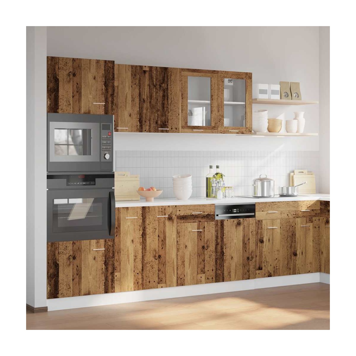 Este juego de 7 armarios de cocina, con un diseño elegante, optimiza el espacio de la cocina y ¡proporciona amplio espacio de almacenaje para tus cosas! Material estable y duradero: La madera de ingeniería es un material duradero y estable con una superficie lisa que es resistente a la humedad, la deformación y la rotura, lo que la convierte en una opción fiable para una variedad de proyectos.Amplio espacio de almacenamiento: el juego de gabinetes de cocina tiene muchos compartimentos y ofrece suficiente espacio para guardar tazones, platos, ollas y otros electrodomésticos de cocina.Patas ajustables: Los gabinetes inferiores cuentan con patas ajustables que se pueden ajustar en altura para adaptarse al diseño de su cocina.Fácil de mantener: Gracias a su superficie lisa, estos gabinetes de cocina son fáciles de limpiar con un paño húmedo y requieren menos mantenimiento. Advertencia:Para evitar que vuelque, este producto debe usarse con el dispositivo de fijación a la pared suministrado. Información útil:Los tornillos y los tacos para el interior de la pared no están incluidos. Busca y utiliza tornillos y tacos adecuados para tus paredes. Si no lo tienes claro, busca asesoramiento profesional. Lee y sigue cada paso de las instrucciones cuidadosamente.La encimera, el fregadero y el grifo no están incluidos en la entrega.