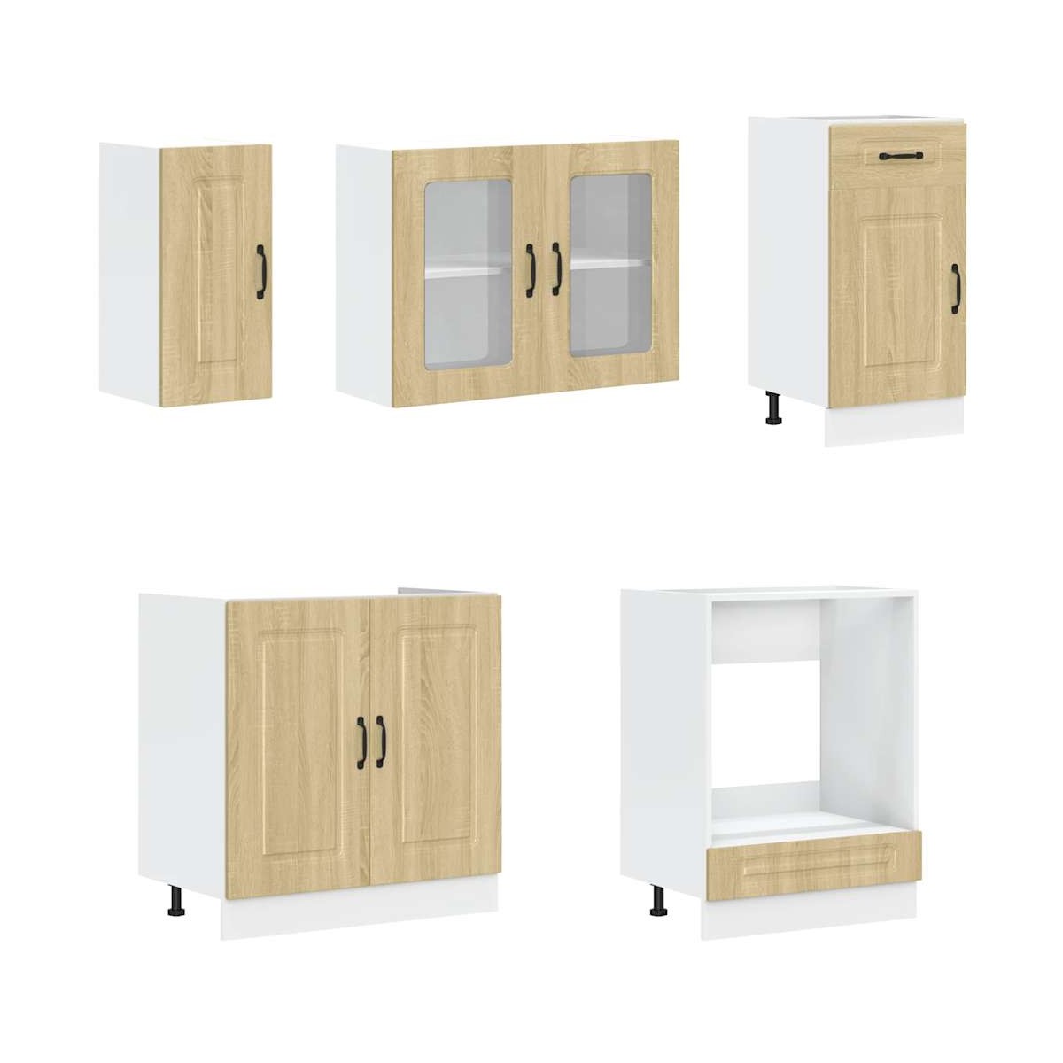 Este juego de 8 armarios de cocina, con un diseño elegante, optimiza el espacio de la cocina y ¡proporciona amplio espacio de almacenaje para tus cosas! Material estable y duradero: La madera de ingeniería es un material duradero y estable con una superficie lisa que es resistente a la humedad, la deformación y la rotura, lo que la convierte en una opción fiable para una variedad de proyectos.Amplio espacio de almacenamiento: el juego de gabinetes de cocina tiene muchos compartimentos y ofrece suficiente espacio para guardar tazones, platos, ollas y otros electrodomésticos de cocina.Patas ajustables: Los gabinetes inferiores cuentan con patas ajustables que se pueden ajustar en altura para adaptarse al diseño de su cocina.Fácil de mantener: Gracias a su superficie lisa, estos gabinetes de cocina son fáciles de limpiar con un paño húmedo y requieren menos mantenimiento. Advertencia:Para evitar que vuelque, este producto debe usarse con el dispositivo de fijación a la pared suministrado. Información útil:Los tornillos y los tacos para el interior de la pared no están incluidos. Busca y utiliza tornillos y tacos adecuados para tus paredes. Si no lo tienes claro, busca asesoramiento profesional. Lee y sigue cada paso de las instrucciones cuidadosamente.La encimera, el fregadero y el grifo no están incluidos en la entrega.