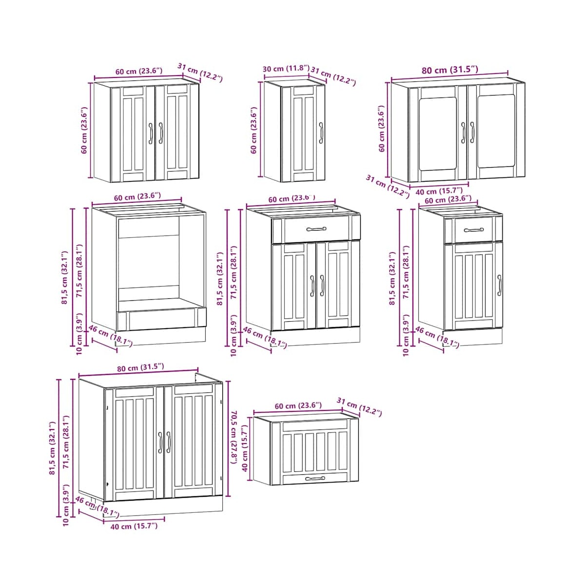 Este juego de 8 armarios de cocina, con un diseño elegante, optimiza el espacio de la cocina y ¡proporciona amplio espacio de almacenaje para tus cosas! Material estable y duradero: La madera de ingeniería es un material duradero y estable con una superficie lisa que es resistente a la humedad, la deformación y la rotura, lo que la convierte en una opción fiable para una variedad de proyectos.Amplio espacio de almacenamiento: el juego de gabinetes de cocina tiene muchos compartimentos y ofrece suficiente espacio para guardar tazones, platos, ollas y otros electrodomésticos de cocina.Patas ajustables: Los gabinetes inferiores cuentan con patas ajustables que se pueden ajustar en altura para adaptarse al diseño de su cocina.Fácil de mantener: Gracias a su superficie lisa, estos gabinetes de cocina son fáciles de limpiar con un paño húmedo y requieren menos mantenimiento. Advertencia:Para evitar que vuelque, este producto debe usarse con el dispositivo de fijación a la pared suministrado. Información útil:Los tornillos y los tacos para el interior de la pared no están incluidos. Busca y utiliza tornillos y tacos adecuados para tus paredes. Si no lo tienes claro, busca asesoramiento profesional. Lee y sigue cada paso de las instrucciones cuidadosamente.La encimera, el fregadero y el grifo no están incluidos en la entrega.