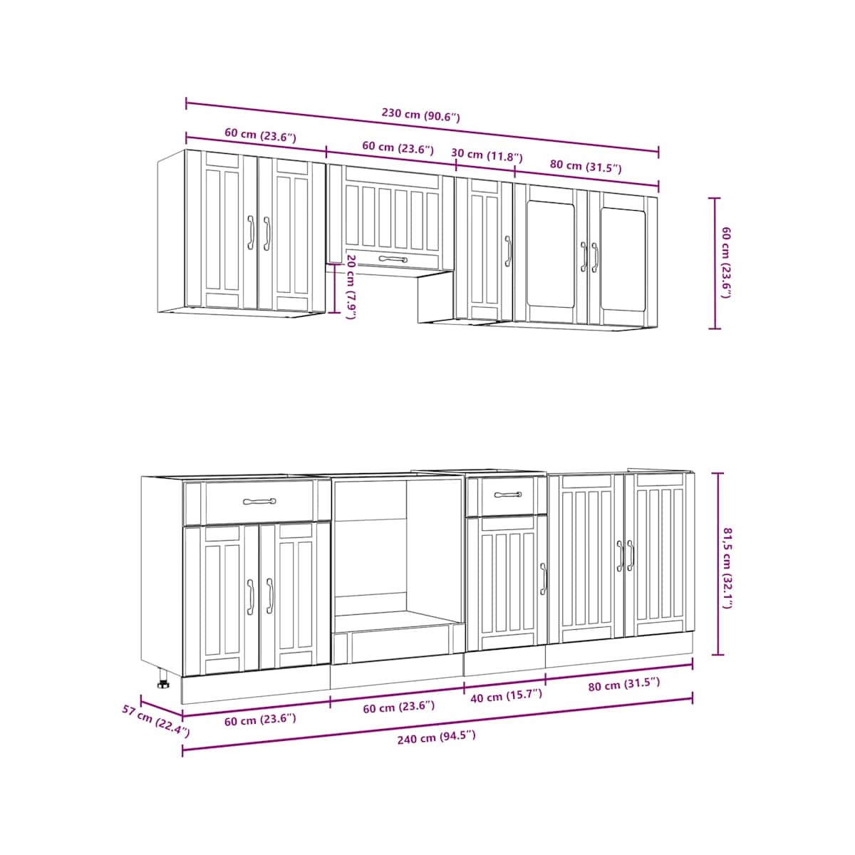 Este juego de 8 armarios de cocina, con un diseño elegante, optimiza el espacio de la cocina y ¡proporciona amplio espacio de almacenaje para tus cosas! Material estable y duradero: La madera de ingeniería es un material duradero y estable con una superficie lisa que es resistente a la humedad, la deformación y la rotura, lo que la convierte en una opción fiable para una variedad de proyectos.Amplio espacio de almacenamiento: el juego de gabinetes de cocina tiene muchos compartimentos y ofrece suficiente espacio para guardar tazones, platos, ollas y otros electrodomésticos de cocina.Patas ajustables: Los gabinetes inferiores cuentan con patas ajustables que se pueden ajustar en altura para adaptarse al diseño de su cocina.Fácil de mantener: Gracias a su superficie lisa, estos gabinetes de cocina son fáciles de limpiar con un paño húmedo y requieren menos mantenimiento. Advertencia:Para evitar que vuelque, este producto debe usarse con el dispositivo de fijación a la pared suministrado. Información útil:Los tornillos y los tacos para el interior de la pared no están incluidos. Busca y utiliza tornillos y tacos adecuados para tus paredes. Si no lo tienes claro, busca asesoramiento profesional. Lee y sigue cada paso de las instrucciones cuidadosamente.La encimera, el fregadero y el grifo no están incluidos en la entrega.
