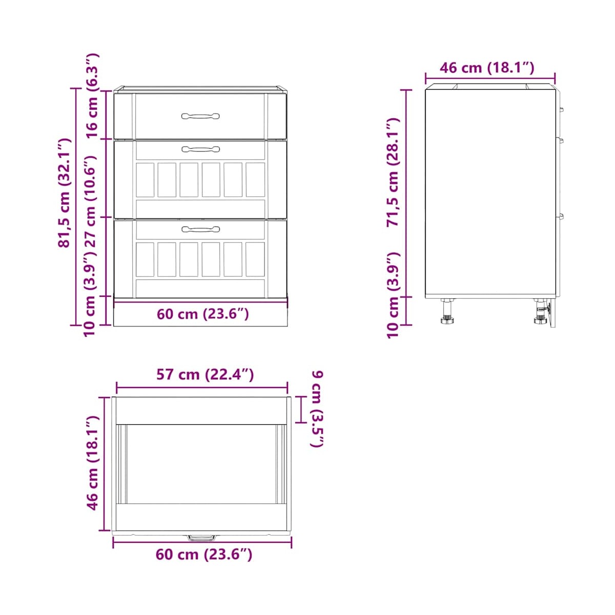 - Dimensiones de cada cajón: 60 x 38,5 x 16/27 cm (ancho x profundo x alto)