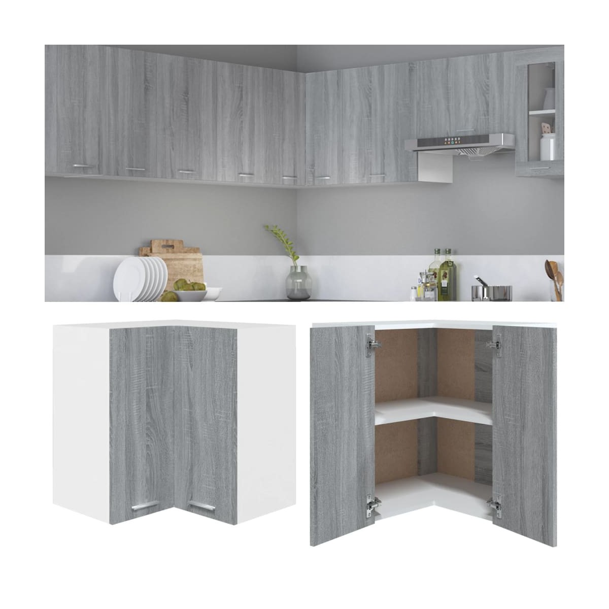 ¡Este armario colgante de esquina para cocina optimiza el espacio de tu cocina, brindando un amplio espacio de almacenamiento para tus pertenencias personales! Material duradero: La madera contrachapada tiene una calidad excepcional, con una superficie lisa y también cuenta con fuerza, estabilidad y resistencia a la humedad. Hecho de madera contrachapada, el armario de cocina es fácil de limpiar.Amplio espacio de almacenamiento: El armario tiene dos estantes, que ofrecen espacio suficiente para guardar cuencos, platos, ollas y otros utensilios de cocina.Puerta práctica: Mantén tu espacio ordenado al esconder los pequeños objetos esenciales detrás de las puertas de este mueble de cocina. Nota:Los tornillos y los tacos para el interior de la pared no están incluidos. Busca y utiliza tornillos y tacos adecuados para tus paredes. Si no lo tienes claro, busca asesoramiento profesional. Lee y sigue cada paso de las instrucciones cuidadosamente.Cada producto viene con un manual de montaje en la caja para facilitar el montaje.