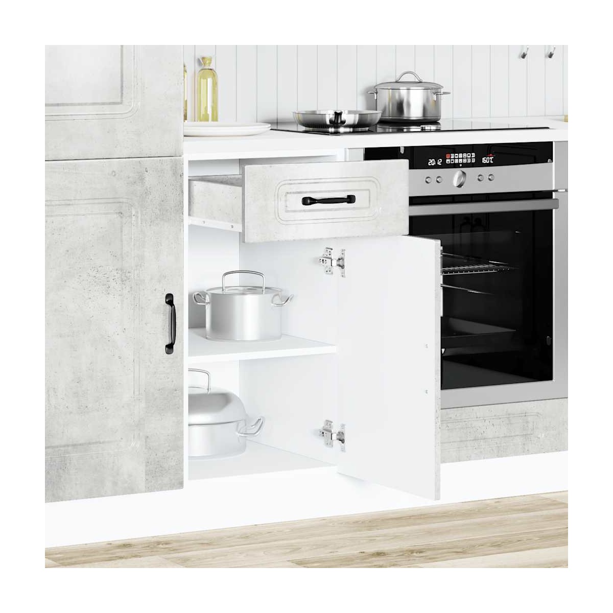 ¡Este gabinete base de cocina optimiza el espacio de su cocina y le brinda amplio espacio de almacenamiento para sus pertenencias personales! Material estable y duradero: La madera de ingeniería es un material duradero y estable con una superficie lisa que es resistente a la humedad, la deformación y la rotura, lo que la convierte en una opción fiable para una variedad de proyectos.Amplio espacio de almacenamiento: el gabinete base de la cocina ofrece suficiente espacio para guardar cuencos, platos, ollas y otros electrodomésticos de cocina.Práctica puerta: la puerta ayuda a mantener un espacio limpio y organizado al ocultar los electrodomésticos de la cocina y el desorden detrás de ellos.Patas ajustables: las patas de este gabinete se pueden ajustar en altura para adaptarse al diseño de su cocina.Fácil de mantener: gracias a su superficie lisa, este mueble base de cocina es fácil de limpiar con un paño húmedo y requiere menos mantenimiento. Advertencia:Para evitar que vuelque, este producto debe usarse con el dispositivo de fijación a la pared suministrado. Información útil:Los tornillos y los tacos para el interior de la pared no están incluidos. Busca y utiliza tornillos y tacos adecuados para tus paredes. Si no lo tienes claro, busca asesoramiento profesional. Lee y sigue cada paso de las instrucciones cuidadosamente.