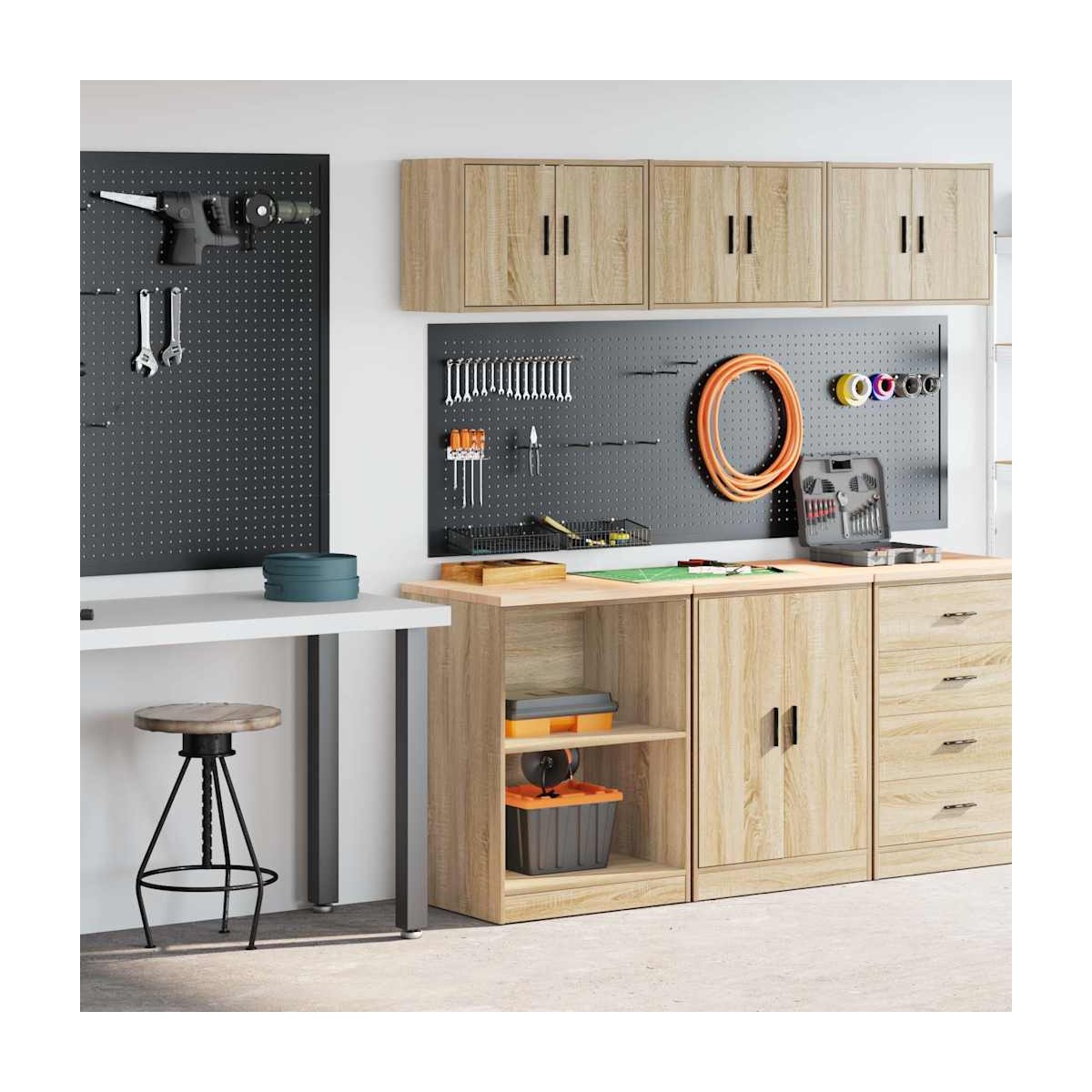 Estos armarios de garaje son una excelente opción para organizar todas sus herramientas y materiales de bricolaje en el garaje, trastero o taller. Durable y de larga duración: este gabinete de garaje está hecho de madera de pino duradera y madera de ingeniería, lo que garantiza estabilidad y robustez para un uso duradero.Amplio espacio de almacenamiento: este gabinete de herramientas le permite mantener sus herramientas de uso frecuente a su alcance, lo que hace que sea conveniente acceder a todo lo que necesita para su próximo proyecto.Superficie de trabajo versátil: la encimera de madera proporciona una superficie resistente para diversas tareas, como reparaciones, montajes o proyectos de bricolaje.Fácil de mantener: Gracias a su superficie lisa, el armario es fácil de limpiar con un paño húmedo y requiere menos mantenimiento.Amplias aplicaciones: este gabinete de almacenamiento de garaje proporciona mucho espacio seguro, lo que lo hace ideal para organizar artículos en diversos entornos, como garajes, oficinas, lavaderos, despensas, sótanos o talleres.Opciones de montaje flexibles: Las puertas del compartimiento se pueden instalar a la izquierda o a la derecha según tu conveniencia y hábitos personales. Información útil:Los tornillos y los tacos para el interior de la pared no están incluidos. Recomendamos encontrar y utilizar tornillos y tacos adecuados específicamente para las paredes. Si no estás seguro, puedes consultar con un profesional. Lee y sigue cada paso de las instrucciones. Advertencia:Para evitar que vuelque, este producto debe usarse con el dispositivo de fijación a la pared suministrado.