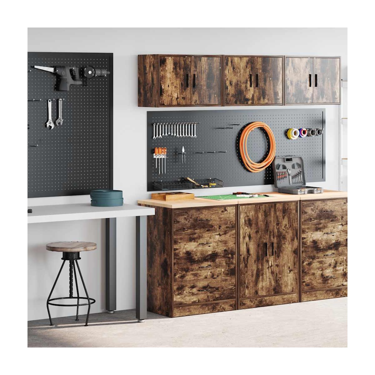 Estos armarios de garaje son una excelente opción para organizar todas sus herramientas y materiales de bricolaje en el garaje, trastero o taller. Durable y de larga duración: este gabinete de garaje está hecho de madera de pino duradera y madera de ingeniería, lo que garantiza estabilidad y robustez para un uso duradero.Amplio espacio de almacenamiento: este gabinete de herramientas le permite mantener sus herramientas de uso frecuente a su alcance, lo que hace que sea conveniente acceder a todo lo que necesita para su próximo proyecto.Superficie de trabajo versátil: la encimera de madera proporciona una superficie resistente para diversas tareas, como reparaciones, montajes o proyectos de bricolaje.Fácil de mantener: Gracias a su superficie lisa, el armario es fácil de limpiar con un paño húmedo y requiere menos mantenimiento.Amplias aplicaciones: este gabinete de almacenamiento de garaje proporciona mucho espacio seguro, lo que lo hace ideal para organizar artículos en diversos entornos, como garajes, oficinas, lavaderos, despensas, sótanos o talleres.Opciones de montaje flexibles: Las puertas del compartimiento se pueden instalar a la izquierda o a la derecha según tu conveniencia y hábitos personales. Información útil:Los tornillos y los tacos para el interior de la pared no están incluidos. Recomendamos encontrar y utilizar tornillos y tacos adecuados específicamente para las paredes. Si no estás seguro, puedes consultar con un profesional. Lee y sigue cada paso de las instrucciones. Advertencia:Para evitar que vuelque, este producto debe usarse con el dispositivo de fijación a la pared suministrado.