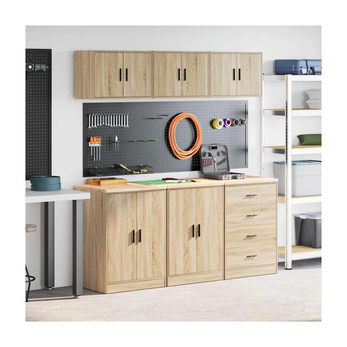 Estos armarios de garaje son una excelente opción para organizar todas sus herramientas y materiales de bricolaje en el garaje, trastero o taller. Durable y de larga duración: este gabinete de garaje está hecho de madera de pino duradera y madera de ingeniería, lo que garantiza estabilidad y robustez para un uso duradero.Amplio espacio de almacenamiento: este gabinete de herramientas le permite mantener sus herramientas de uso frecuente a su alcance, lo que hace que sea conveniente acceder a todo lo que necesita para su próximo proyecto.Superficie de trabajo versátil: la encimera de madera proporciona una superficie resistente para diversas tareas, como reparaciones, montajes o proyectos de bricolaje.Fácil de mantener: Gracias a su superficie lisa, el armario es fácil de limpiar con un paño húmedo y requiere menos mantenimiento.Amplias aplicaciones: este gabinete de almacenamiento de garaje proporciona mucho espacio seguro, lo que lo hace ideal para organizar artículos en diversos entornos, como garajes, oficinas, lavaderos, despensas, sótanos o talleres.Opciones de montaje flexibles: Las puertas del compartimiento se pueden instalar a la izquierda o a la derecha según tu conveniencia y hábitos personales. Información útil:Los tornillos y los tacos para el interior de la pared no están incluidos. Recomendamos encontrar y utilizar tornillos y tacos adecuados específicamente para las paredes. Si no estás seguro, puedes consultar con un profesional. Lee y sigue cada paso de las instrucciones. Advertencia:Para evitar que vuelque, este producto debe usarse con el dispositivo de fijación a la pared suministrado.