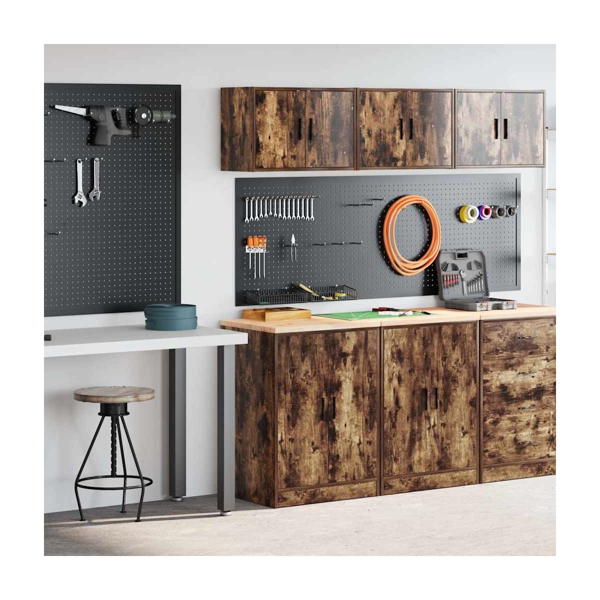 Estos armarios de garaje son una excelente opción para organizar todas sus herramientas y materiales de bricolaje en el garaje, trastero o taller. Durable y de larga duración: este gabinete de garaje está hecho de madera de pino duradera y madera de ingeniería, lo que garantiza estabilidad y robustez para un uso duradero.Amplio espacio de almacenamiento: este gabinete de herramientas le permite mantener sus herramientas de uso frecuente a su alcance, lo que hace que sea conveniente acceder a todo lo que necesita para su próximo proyecto.Superficie de trabajo versátil: la encimera de madera proporciona una superficie resistente para diversas tareas, como reparaciones, montajes o proyectos de bricolaje.Fácil de mantener: Gracias a su superficie lisa, el armario es fácil de limpiar con un paño húmedo y requiere menos mantenimiento.Amplias aplicaciones: este gabinete de almacenamiento de garaje proporciona mucho espacio seguro, lo que lo hace ideal para organizar artículos en diversos entornos, como garajes, oficinas, lavaderos, despensas, sótanos o talleres.Opciones de montaje flexibles: Las puertas del compartimiento se pueden instalar a la izquierda o a la derecha según tu conveniencia y hábitos personales. Información útil:Los tornillos y los tacos para el interior de la pared no están incluidos. Recomendamos encontrar y utilizar tornillos y tacos adecuados específicamente para las paredes. Si no estás seguro, puedes consultar con un profesional. Lee y sigue cada paso de las instrucciones. Advertencia:Para evitar que vuelque, este producto debe usarse con el dispositivo de fijación a la pared suministrado.