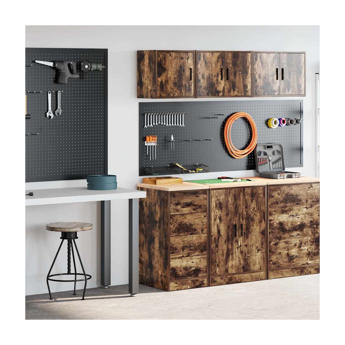 Estos armarios de garaje son una excelente opción para organizar todas sus herramientas y materiales de bricolaje en el garaje, trastero o taller. Durable y de larga duración: este gabinete de garaje está hecho de madera de pino duradera y madera de ingeniería, lo que garantiza estabilidad y robustez para un uso duradero.Amplio espacio de almacenamiento: este gabinete de herramientas le permite mantener sus herramientas de uso frecuente a su alcance, lo que hace que sea conveniente acceder a todo lo que necesita para su próximo proyecto.Superficie de trabajo versátil: la encimera de madera proporciona una superficie resistente para diversas tareas, como reparaciones, montajes o proyectos de bricolaje.Fácil de mantener: Gracias a su superficie lisa, el armario es fácil de limpiar con un paño húmedo y requiere menos mantenimiento.Amplias aplicaciones: este gabinete de almacenamiento de garaje proporciona mucho espacio seguro, lo que lo hace ideal para organizar artículos en diversos entornos, como garajes, oficinas, lavaderos, despensas, sótanos o talleres.Opciones de montaje flexibles: Las puertas del compartimiento se pueden instalar a la izquierda o a la derecha según tu conveniencia y hábitos personales. Información útil:Los tornillos y los tacos para el interior de la pared no están incluidos. Recomendamos encontrar y utilizar tornillos y tacos adecuados específicamente para las paredes. Si no estás seguro, puedes consultar con un profesional. Lee y sigue cada paso de las instrucciones. Advertencia:Para evitar que vuelque, este producto debe usarse con el dispositivo de fijación a la pared suministrado.