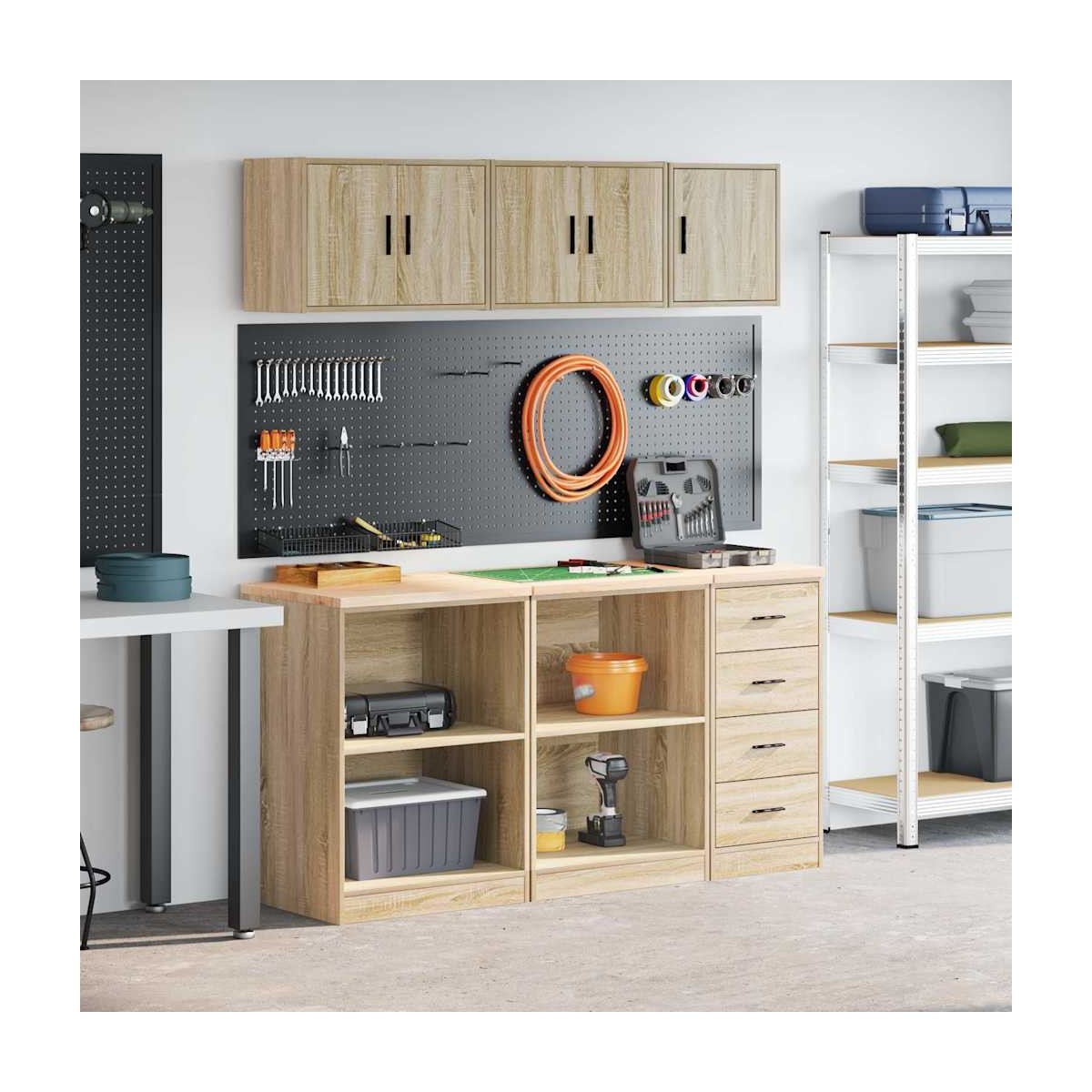 Estos armarios de garaje son una excelente opción para organizar todas sus herramientas y materiales de bricolaje en el garaje, trastero o taller. Durable y de larga duración: este gabinete de garaje está hecho de madera de pino duradera y madera de ingeniería, lo que garantiza estabilidad y robustez para un uso duradero.Amplio espacio de almacenamiento: este gabinete de herramientas le permite mantener sus herramientas de uso frecuente a su alcance, lo que hace que sea conveniente acceder a todo lo que necesita para su próximo proyecto.Superficie de trabajo versátil: la encimera de madera proporciona una superficie resistente para diversas tareas, como reparaciones, montajes o proyectos de bricolaje.Fácil de mantener: Gracias a su superficie lisa, el armario es fácil de limpiar con un paño húmedo y requiere menos mantenimiento.Amplias aplicaciones: este gabinete de almacenamiento de garaje proporciona mucho espacio seguro, lo que lo hace ideal para organizar artículos en diversos entornos, como garajes, oficinas, lavaderos, despensas, sótanos o talleres.Opciones de montaje flexibles: Las puertas del compartimiento se pueden instalar a la izquierda o a la derecha según tu conveniencia y hábitos personales. Información útil:Los tornillos y los tacos para el interior de la pared no están incluidos. Recomendamos encontrar y utilizar tornillos y tacos adecuados específicamente para las paredes. Si no estás seguro, puedes consultar con un profesional. Lee y sigue cada paso de las instrucciones. Advertencia:Para evitar que vuelque, este producto debe usarse con el dispositivo de fijación a la pared suministrado.