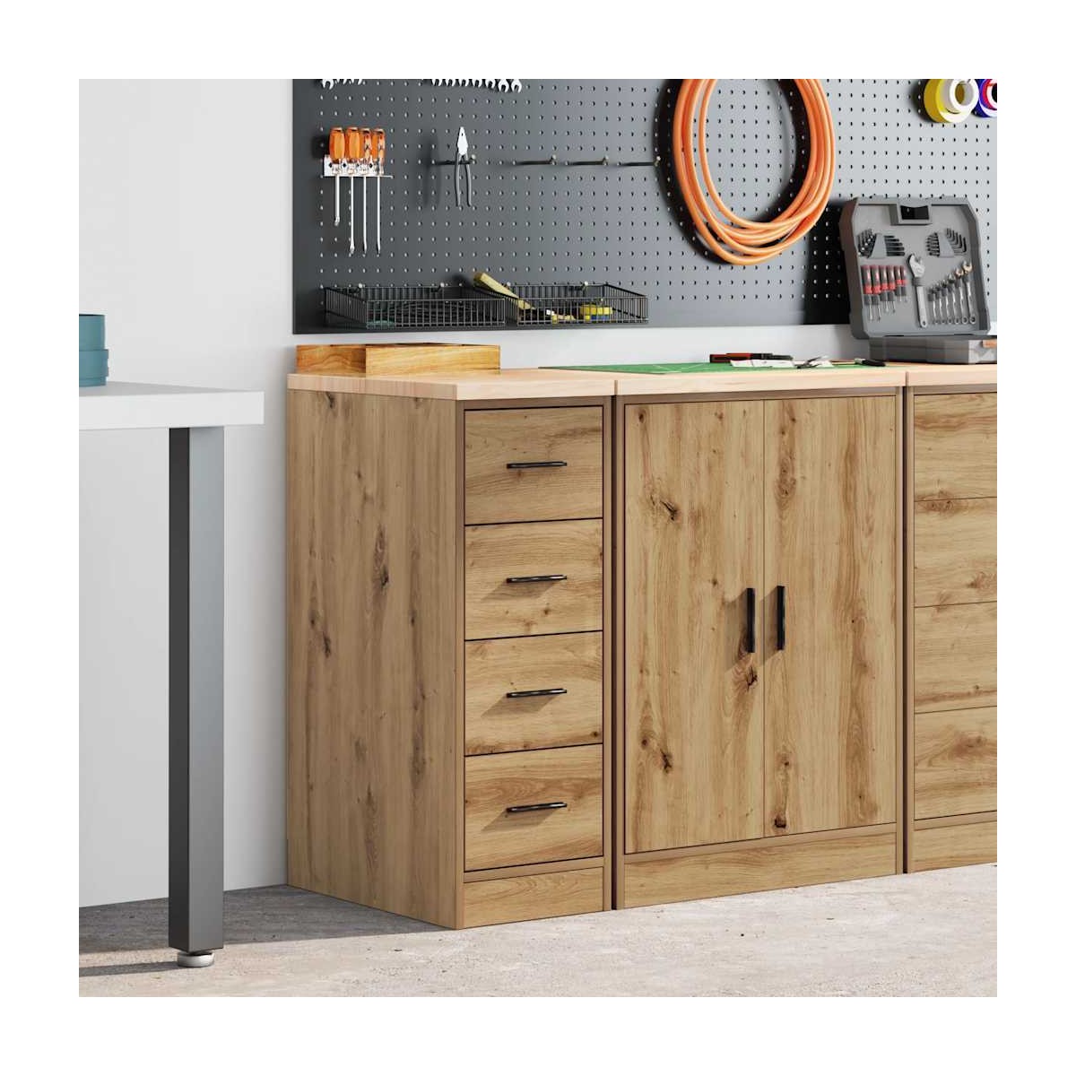 Este armario de almacenamiento de garaje es una excelente opción para organizar todas sus herramientas y materiales de bricolaje en el garaje, el trastero o el taller. Durable y de larga duración: este gabinete de garaje está hecho de madera de pino duradera y madera de ingeniería, lo que garantiza estabilidad y robustez para un uso duradero.Amplio espacio de almacenamiento: con cuatro cajones espaciosos, este gabinete de herramientas le permite mantener las herramientas de uso frecuente al alcance de la mano, lo que hace que sea conveniente acceder a todo lo que necesita para su próximo proyecto.Superficie de trabajo versátil: la encimera de madera proporciona una superficie resistente para diversas tareas, como reparaciones, montajes o proyectos de bricolaje.Fácil de mantener: Gracias a su superficie lisa, el armario es fácil de limpiar con un paño húmedo y requiere menos mantenimiento.Amplias aplicaciones: este gabinete de almacenamiento de garaje proporciona mucho espacio seguro, lo que lo hace ideal para organizar artículos en diversos entornos, como garajes, oficinas, lavaderos, despensas, sótanos o talleres. Advertencia:Para evitar que vuelque, este producto debe usarse con el dispositivo de fijación a la pared suministrado.