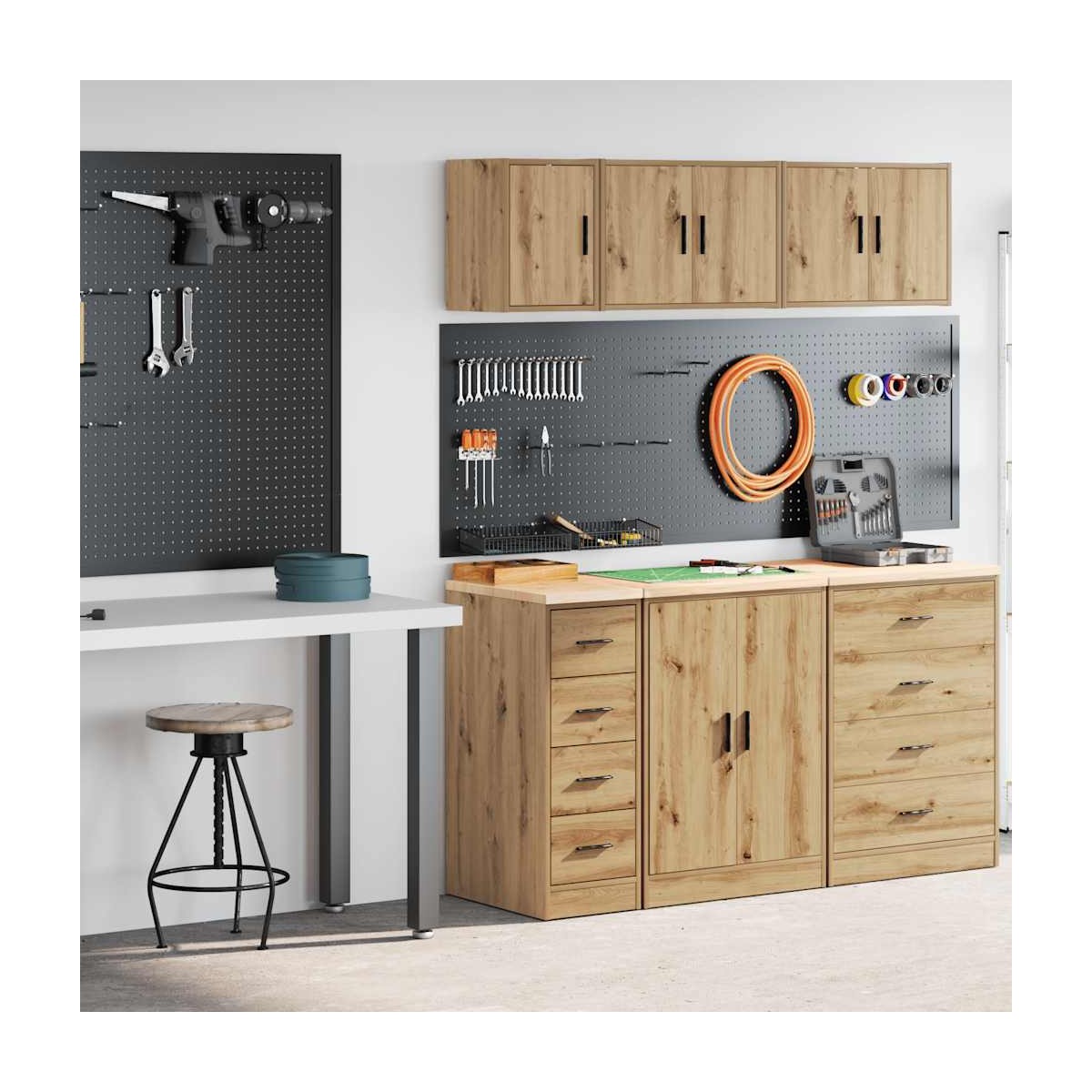 Estos armarios de garaje son una excelente opción para organizar todas sus herramientas y materiales de bricolaje en el garaje, trastero o taller. Durable y de larga duración: este gabinete de garaje está hecho de madera de pino duradera y madera de ingeniería, lo que garantiza estabilidad y robustez para un uso duradero.Amplio espacio de almacenamiento: este gabinete de herramientas le permite mantener sus herramientas de uso frecuente a su alcance, lo que hace que sea conveniente acceder a todo lo que necesita para su próximo proyecto.Superficie de trabajo versátil: la encimera de madera proporciona una superficie resistente para diversas tareas, como reparaciones, montajes o proyectos de bricolaje.Fácil de mantener: Gracias a su superficie lisa, el armario es fácil de limpiar con un paño húmedo y requiere menos mantenimiento.Amplias aplicaciones: este gabinete de almacenamiento de garaje proporciona mucho espacio seguro, lo que lo hace ideal para organizar artículos en diversos entornos, como garajes, oficinas, lavaderos, despensas, sótanos o talleres.Opciones de montaje flexibles: Las puertas del compartimiento se pueden instalar a la izquierda o a la derecha según tu conveniencia y hábitos personales. Información útil:Los tornillos y los tacos para el interior de la pared no están incluidos. Recomendamos encontrar y utilizar tornillos y tacos adecuados específicamente para las paredes. Si no estás seguro, puedes consultar con un profesional. Lee y sigue cada paso de las instrucciones. Advertencia:Para evitar que vuelque, este producto debe usarse con el dispositivo de fijación a la pared suministrado.