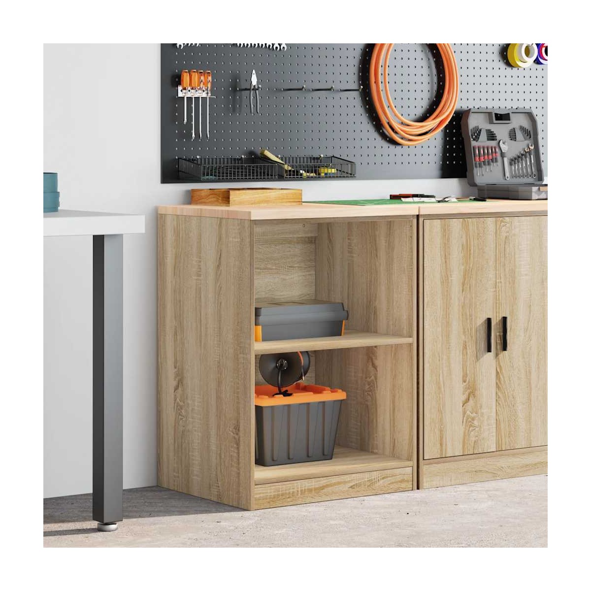 Este armario de almacenamiento de garaje es una excelente opción para organizar todas sus herramientas y materiales de bricolaje en el garaje, el trastero o el taller. Durable y de larga duración: este gabinete de garaje está hecho de madera de pino duradera y madera de ingeniería, lo que garantiza estabilidad y robustez para un uso duradero.Amplio espacio de almacenamiento: con 2 estantes de almacenamiento, este gabinete de herramientas le permite mantener sus herramientas de uso frecuente a su alcance, lo que hace que sea conveniente acceder a todo lo que necesita para su próximo proyecto.Superficie de trabajo versátil: la encimera de madera proporciona una superficie resistente para diversas tareas, como reparaciones, montajes o proyectos de bricolaje.Fácil de mantener: Gracias a su superficie lisa, el armario es fácil de limpiar con un paño húmedo y requiere menos mantenimiento.Amplias aplicaciones: este gabinete de almacenamiento de garaje proporciona mucho espacio seguro, lo que lo hace ideal para organizar artículos en diversos entornos, como garajes, oficinas, lavaderos, despensas, sótanos o talleres. Advertencia:Para evitar que vuelque, este producto debe usarse con el dispositivo de fijación a la pared suministrado.