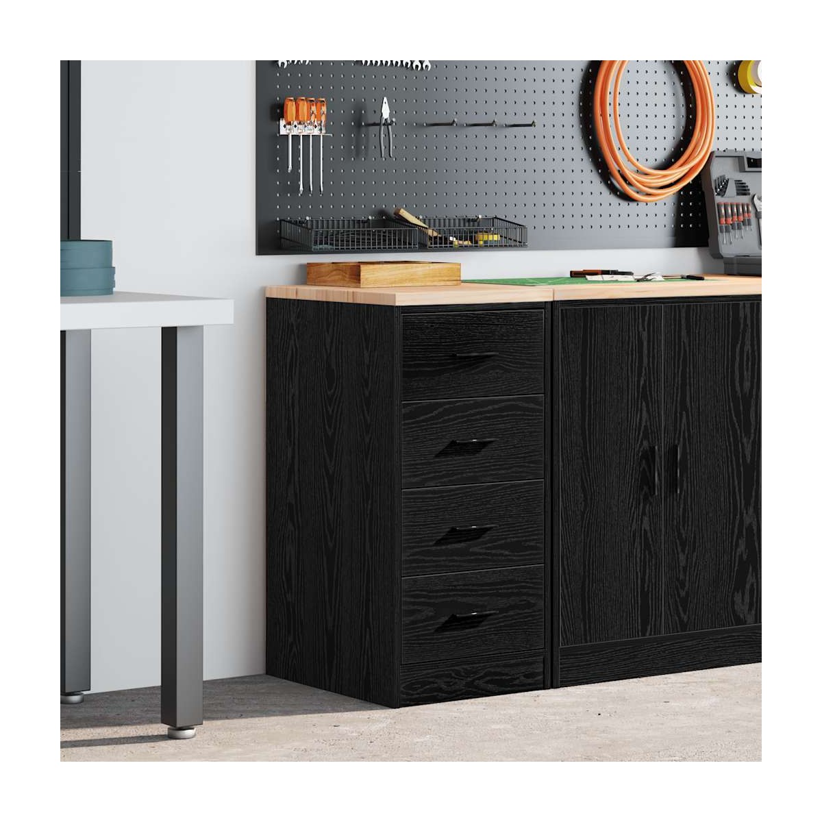 Este armario de almacenamiento de garaje es una excelente opción para organizar todas sus herramientas y materiales de bricolaje en el garaje, el trastero o el taller. Durable y de larga duración: este gabinete de garaje está hecho de madera de pino duradera y madera de ingeniería, lo que garantiza estabilidad y robustez para un uso duradero.Amplio espacio de almacenamiento: con cuatro cajones espaciosos, este gabinete de herramientas le permite mantener las herramientas de uso frecuente al alcance de la mano, lo que hace que sea conveniente acceder a todo lo que necesita para su próximo proyecto.Superficie de trabajo versátil: la encimera de madera proporciona una superficie resistente para diversas tareas, como reparaciones, montajes o proyectos de bricolaje.Fácil de mantener: Gracias a su superficie lisa, el armario es fácil de limpiar con un paño húmedo y requiere menos mantenimiento.Amplias aplicaciones: este gabinete de almacenamiento de garaje proporciona mucho espacio seguro, lo que lo hace ideal para organizar artículos en diversos entornos, como garajes, oficinas, lavaderos, despensas, sótanos o talleres. Advertencia:Para evitar que vuelque, este producto debe usarse con el dispositivo de fijación a la pared suministrado.