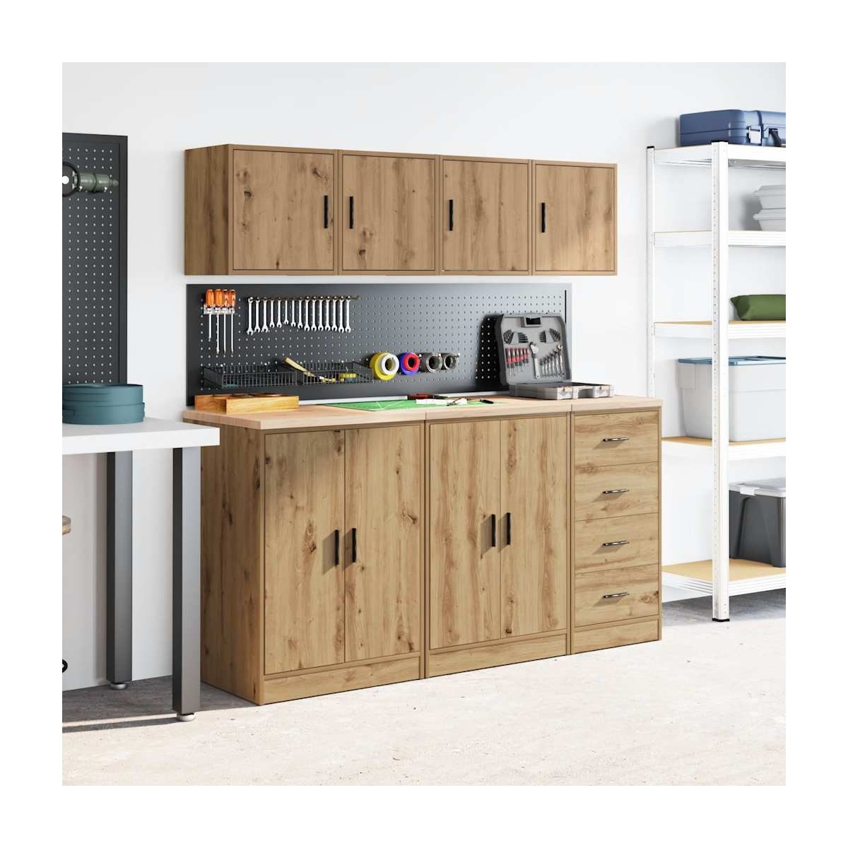 Estos gabinetes de pared para garaje son perfectos para guardar herramientas y accesorios sin ocupar espacio en el piso. Material estable y duradero: La madera de ingeniería es un material duradero y estable con una superficie lisa que es resistente a la humedad, la deformación y la rotura, lo que la convierte en una opción fiable para una variedad de proyectos.Amplio espacio de almacenamiento: con un espacioso compartimento detrás de la puerta, el armario de pared del garaje ofrece fácil acceso a sus herramientas y accesorios.Práctica puerta: La puerta ayuda a mantener un espacio limpio y organizado ocultando pequeños objetos esenciales y desorden detrás de ellos.Fácil de mantener: Gracias a su superficie lisa, el armario es fácil de limpiar con un paño húmedo y requiere menos mantenimiento.Amplias aplicaciones: este gabinete de almacenamiento de garaje proporciona mucho espacio seguro, lo que lo hace ideal para organizar artículos en diversos entornos, como garajes, oficinas, lavaderos, despensas, sótanos o talleres. Información útil:Los tornillos y los tacos para el interior de la pared no están incluidos. Recomendamos encontrar y utilizar tornillos y tacos adecuados específicamente para las paredes. Si no estás seguro, puedes consultar con un profesional. Lee y sigue cada paso de las instrucciones.