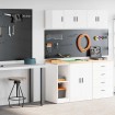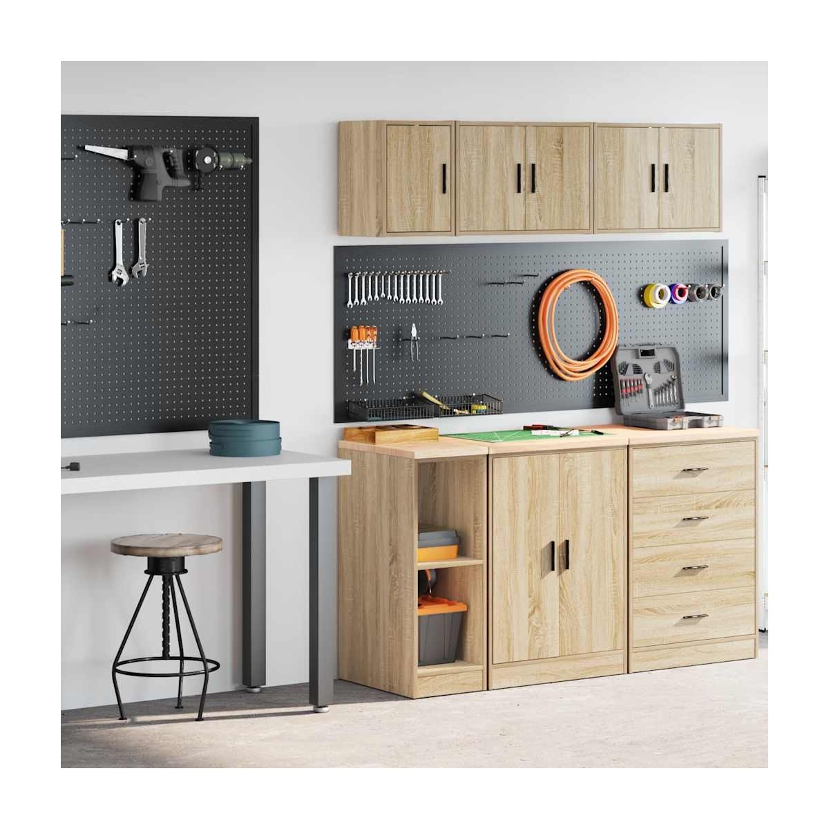 Estos armarios de garaje son una excelente opción para organizar todas sus herramientas y materiales de bricolaje en el garaje, trastero o taller. Durable y de larga duración: este gabinete de garaje está hecho de madera de pino duradera y madera de ingeniería, lo que garantiza estabilidad y robustez para un uso duradero.Amplio espacio de almacenamiento: este gabinete de herramientas le permite mantener sus herramientas de uso frecuente a su alcance, lo que hace que sea conveniente acceder a todo lo que necesita para su próximo proyecto.Superficie de trabajo versátil: la encimera de madera proporciona una superficie resistente para diversas tareas, como reparaciones, montajes o proyectos de bricolaje.Fácil de mantener: Gracias a su superficie lisa, el armario es fácil de limpiar con un paño húmedo y requiere menos mantenimiento.Amplias aplicaciones: este gabinete de almacenamiento de garaje proporciona mucho espacio seguro, lo que lo hace ideal para organizar artículos en diversos entornos, como garajes, oficinas, lavaderos, despensas, sótanos o talleres.Opciones de montaje flexibles: Las puertas del compartimiento se pueden instalar a la izquierda o a la derecha según tu conveniencia y hábitos personales. Información útil:Los tornillos y los tacos para el interior de la pared no están incluidos. Recomendamos encontrar y utilizar tornillos y tacos adecuados específicamente para las paredes. Si no estás seguro, puedes consultar con un profesional. Lee y sigue cada paso de las instrucciones. Advertencia:Para evitar que vuelque, este producto debe usarse con el dispositivo de fijación a la pared suministrado.