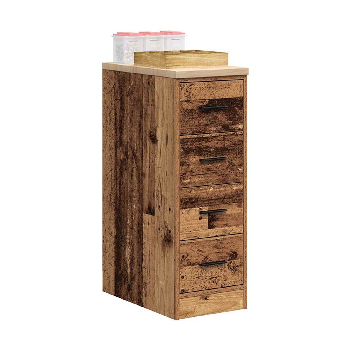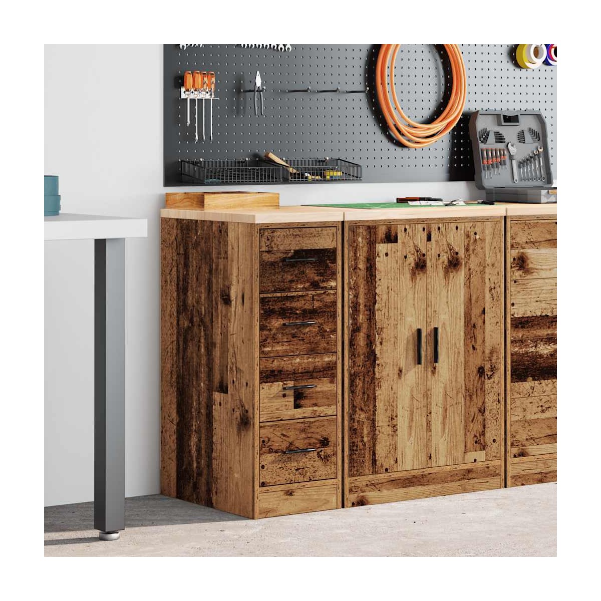 Este armario de almacenamiento de garaje es una excelente opción para organizar todas sus herramientas y materiales de bricolaje en el garaje, el trastero o el taller. Durable y de larga duración: este gabinete de garaje está hecho de madera de pino duradera y madera de ingeniería, lo que garantiza estabilidad y robustez para un uso duradero.Amplio espacio de almacenamiento: con cuatro cajones espaciosos, este gabinete de herramientas le permite mantener las herramientas de uso frecuente al alcance de la mano, lo que hace que sea conveniente acceder a todo lo que necesita para su próximo proyecto.Superficie de trabajo versátil: la encimera de madera proporciona una superficie resistente para diversas tareas, como reparaciones, montajes o proyectos de bricolaje.Fácil de mantener: Gracias a su superficie lisa, el armario es fácil de limpiar con un paño húmedo y requiere menos mantenimiento.Amplias aplicaciones: este gabinete de almacenamiento de garaje proporciona mucho espacio seguro, lo que lo hace ideal para organizar artículos en diversos entornos, como garajes, oficinas, lavaderos, despensas, sótanos o talleres. Advertencia:Para evitar que vuelque, este producto debe usarse con el dispositivo de fijación a la pared suministrado.