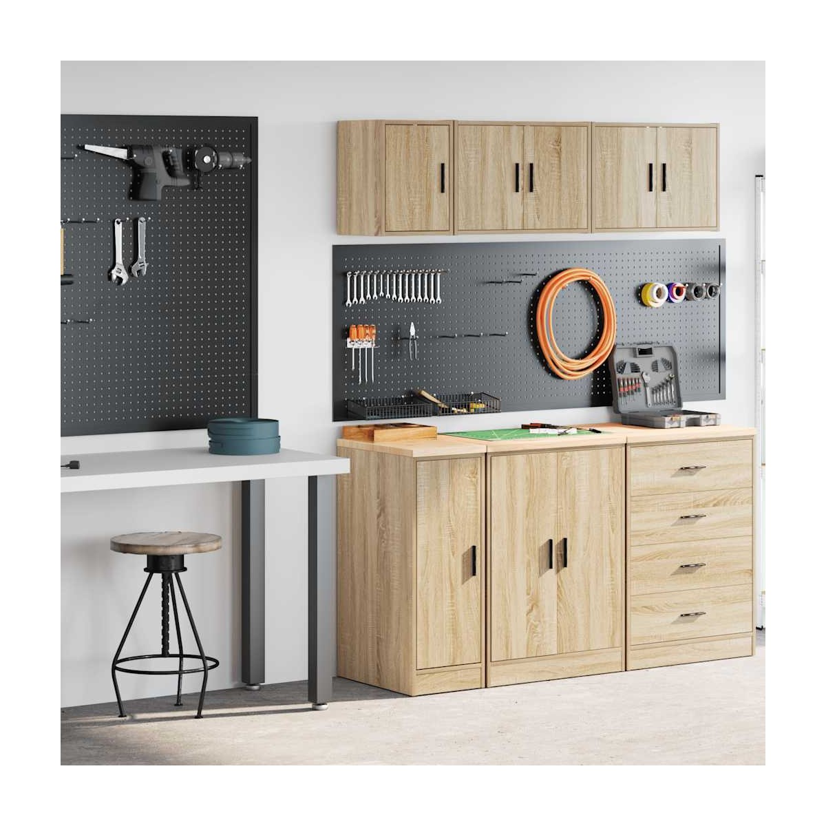 Estos armarios de garaje son una excelente opción para organizar todas sus herramientas y materiales de bricolaje en el garaje, trastero o taller. Durable y de larga duración: este gabinete de garaje está hecho de madera de pino duradera y madera de ingeniería, lo que garantiza estabilidad y robustez para un uso duradero.Amplio espacio de almacenamiento: este gabinete de herramientas le permite mantener sus herramientas de uso frecuente a su alcance, lo que hace que sea conveniente acceder a todo lo que necesita para su próximo proyecto.Superficie de trabajo versátil: la encimera de madera proporciona una superficie resistente para diversas tareas, como reparaciones, montajes o proyectos de bricolaje.Fácil de mantener: Gracias a su superficie lisa, el armario es fácil de limpiar con un paño húmedo y requiere menos mantenimiento.Amplias aplicaciones: este gabinete de almacenamiento de garaje proporciona mucho espacio seguro, lo que lo hace ideal para organizar artículos en diversos entornos, como garajes, oficinas, lavaderos, despensas, sótanos o talleres.Opciones de montaje flexibles: Las puertas del compartimiento se pueden instalar a la izquierda o a la derecha según tu conveniencia y hábitos personales. Información útil:Los tornillos y los tacos para el interior de la pared no están incluidos. Recomendamos encontrar y utilizar tornillos y tacos adecuados específicamente para las paredes. Si no estás seguro, puedes consultar con un profesional. Lee y sigue cada paso de las instrucciones. Advertencia:Para evitar que vuelque, este producto debe usarse con el dispositivo de fijación a la pared suministrado.