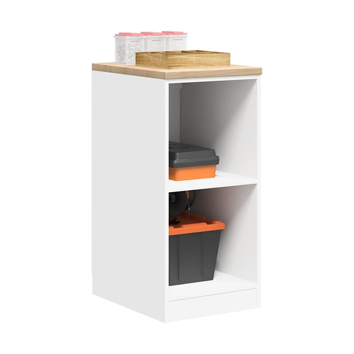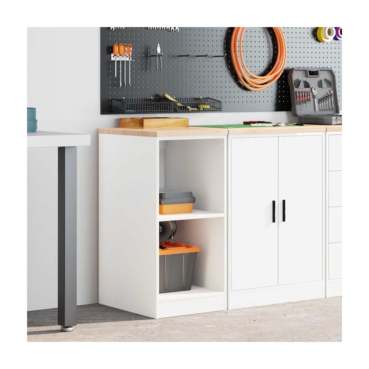 Este armario de almacenamiento de garaje es una excelente opción para organizar todas sus herramientas y materiales de bricolaje en el garaje, el trastero o el taller. Durable y de larga duración: este gabinete de garaje está hecho de madera de pino duradera y madera de ingeniería, lo que garantiza estabilidad y robustez para un uso duradero.Amplio espacio de almacenamiento: con 2 estantes de almacenamiento, este gabinete de herramientas le permite mantener sus herramientas de uso frecuente a su alcance, lo que hace que sea conveniente acceder a todo lo que necesita para su próximo proyecto.Superficie de trabajo versátil: la encimera de madera proporciona una superficie resistente para diversas tareas, como reparaciones, montajes o proyectos de bricolaje.Fácil de mantener: Gracias a su superficie lisa, el armario es fácil de limpiar con un paño húmedo y requiere menos mantenimiento.Amplias aplicaciones: este gabinete de almacenamiento de garaje proporciona mucho espacio seguro, lo que lo hace ideal para organizar artículos en diversos entornos, como garajes, oficinas, lavaderos, despensas, sótanos o talleres. Advertencia:Para evitar que vuelque, este producto debe usarse con el dispositivo de fijación a la pared suministrado.