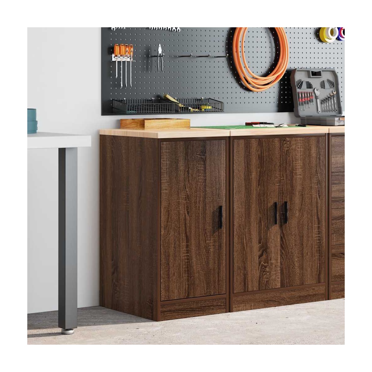 Este armario de almacenamiento de garaje es una excelente opción para organizar todas sus herramientas y materiales de bricolaje en el garaje, el trastero o el taller. Durable y de larga duración: este gabinete de garaje está hecho de madera de pino duradera y madera de ingeniería, lo que garantiza estabilidad y robustez para un uso duradero.Amplio espacio de almacenamiento: con 2 compartimentos de almacenamiento detrás de las puertas, este gabinete de herramientas le permite mantener sus herramientas de uso frecuente a su alcance, lo que hace que sea conveniente acceder a todo lo que necesita para su próximo proyecto.Superficie de trabajo versátil: la encimera de madera proporciona una superficie resistente para diversas tareas, como reparaciones, montajes o proyectos de bricolaje.Fácil de mantener: Gracias a su superficie lisa, el armario es fácil de limpiar con un paño húmedo y requiere menos mantenimiento.Amplias aplicaciones: este gabinete de almacenamiento de garaje proporciona mucho espacio seguro, lo que lo hace ideal para organizar artículos en diversos entornos, como garajes, oficinas, lavaderos, despensas, sótanos o talleres. Advertencia:Para evitar que vuelque, este producto debe usarse con el dispositivo de fijación a la pared suministrado.
